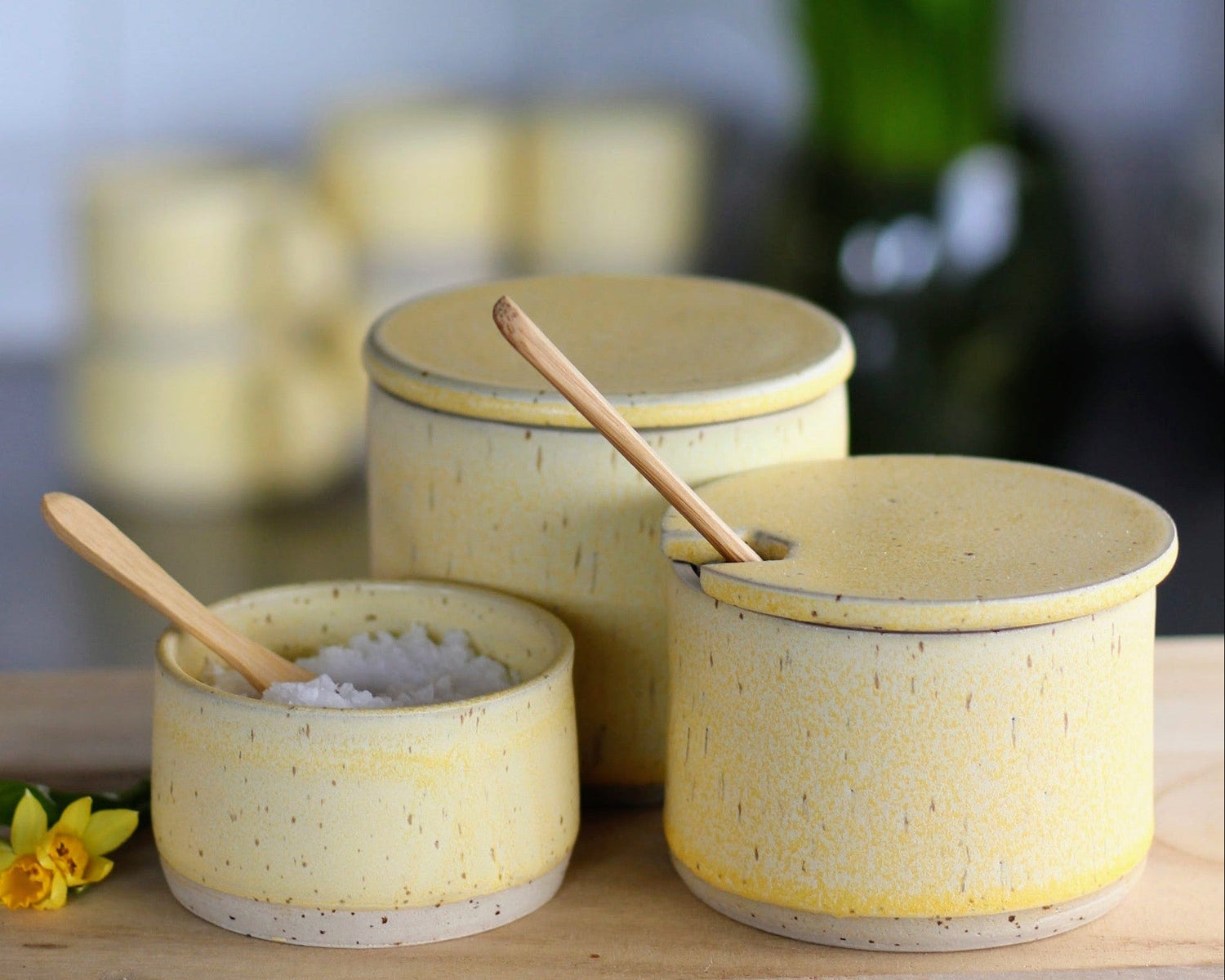 Hva med en hyggelig liten trio på kjøkkenbenken? Jeg lager både sukkerkrukker og saltkar i samme serie som smørklokken. Flere farger kommer.