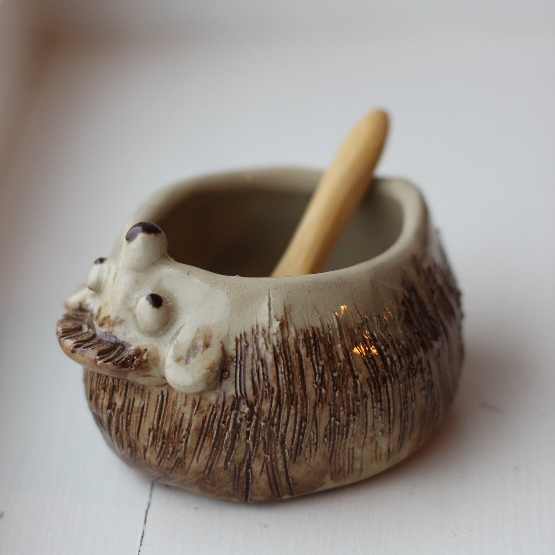 Liten krukke formet som et pinnsvin som ligger på ryggen. Kan brukes til bordsalt, smykker eller andre ting. Lys leire med brune detaljer. Glasert. Liten skje i bambus følger med.