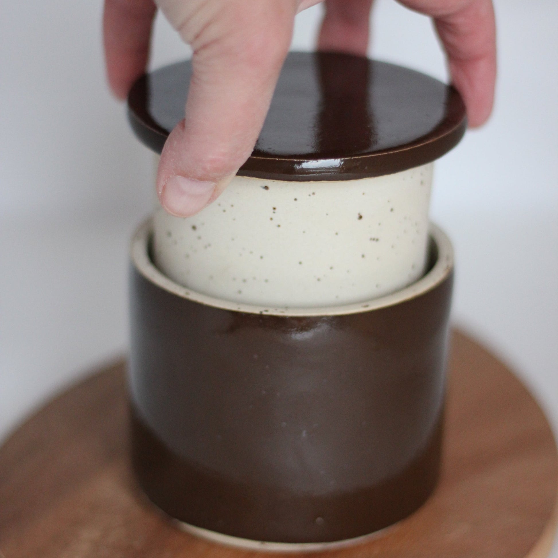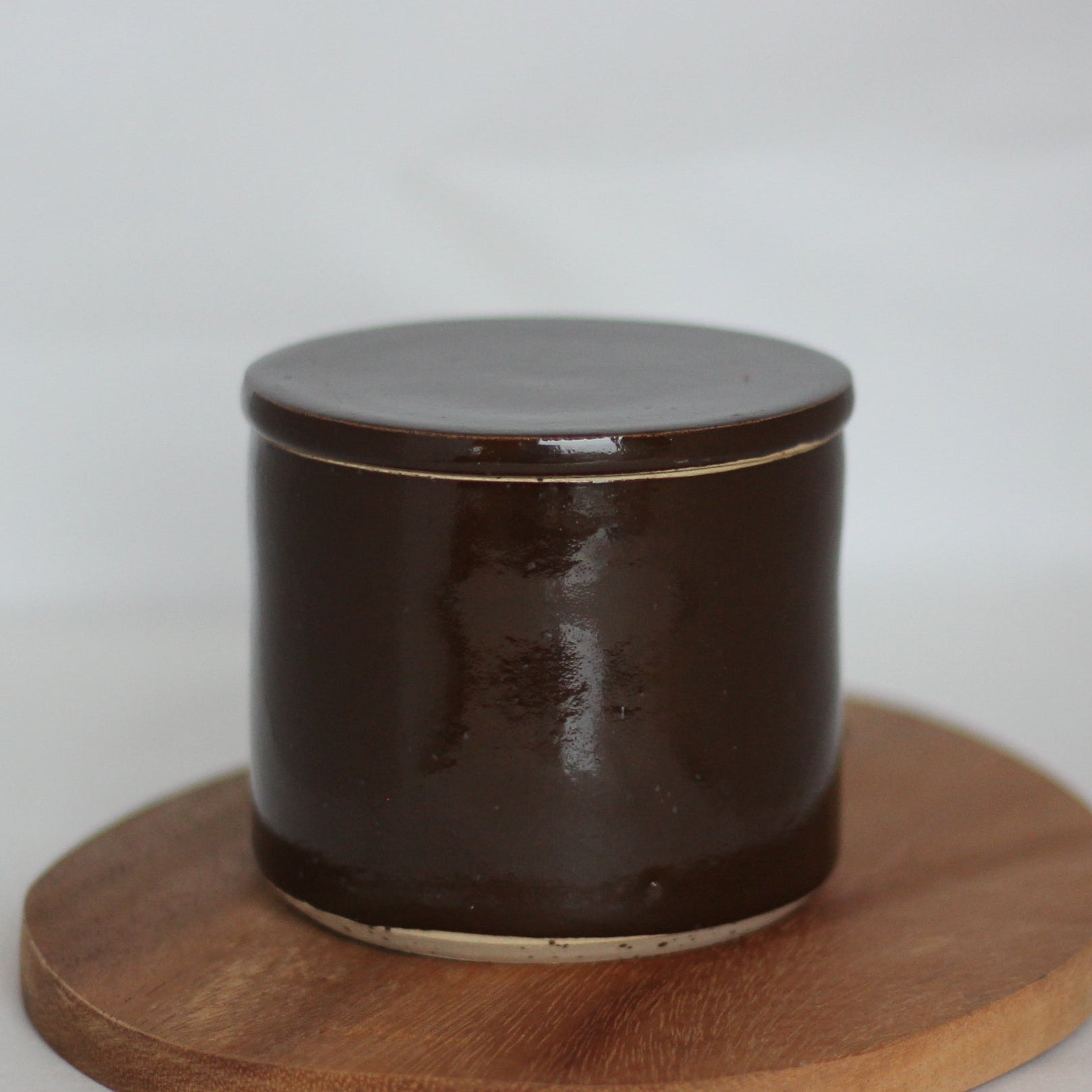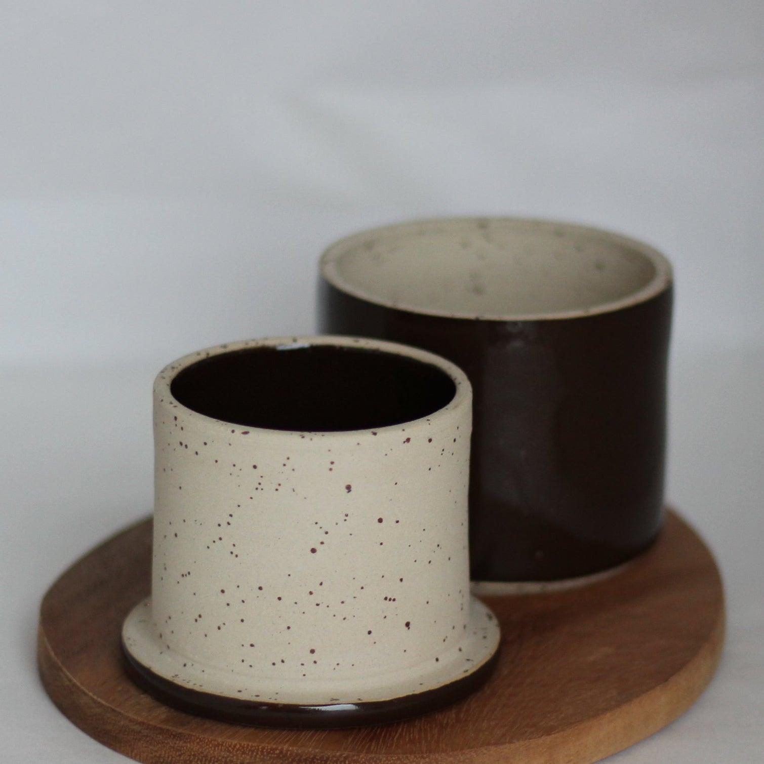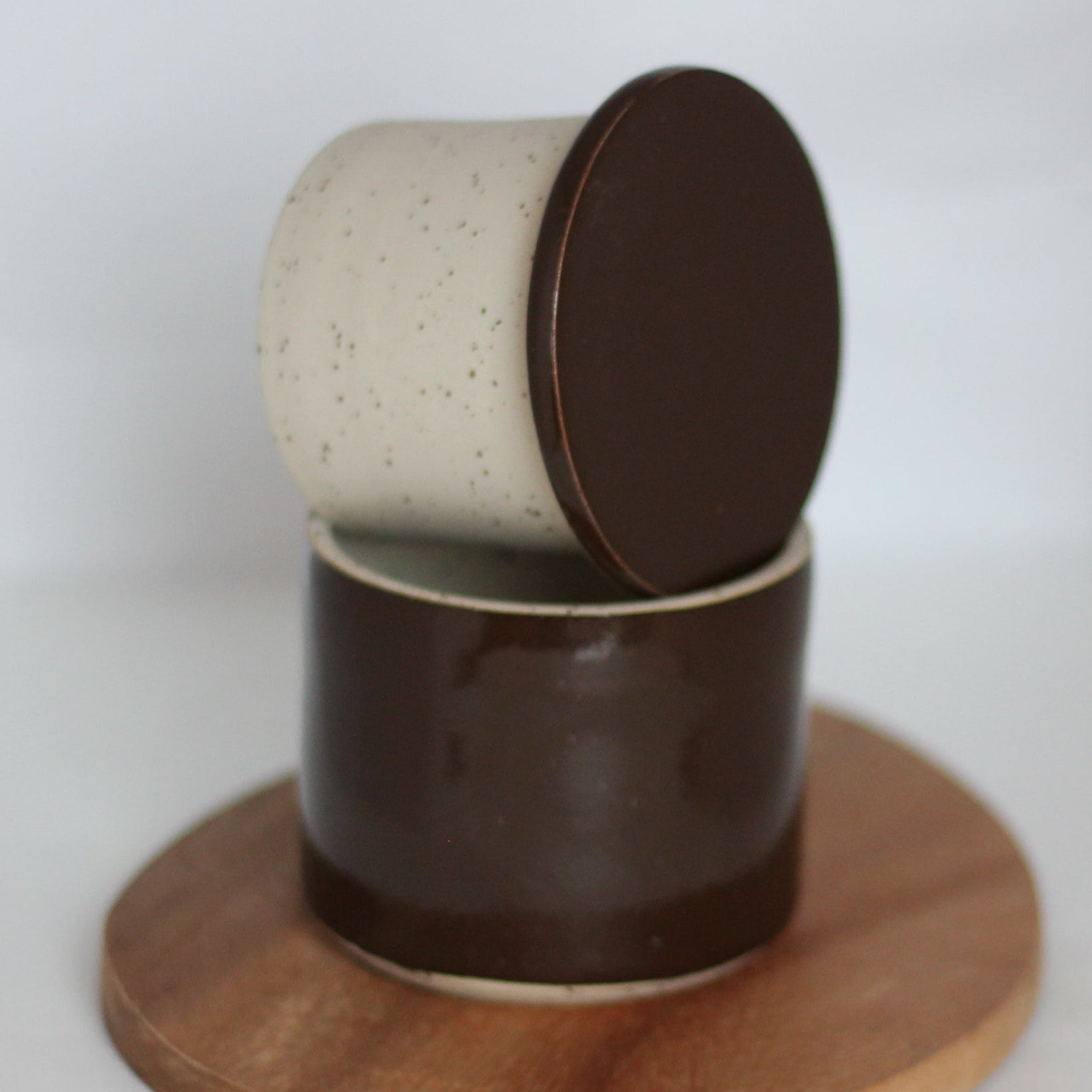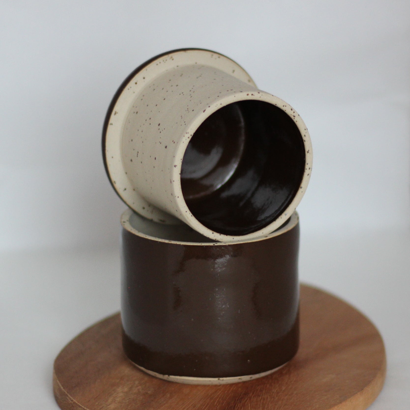 Den spettete leiren og glasuren jeg bruker gjør at hvert produkt kan få litt ulik karakter og litt ulike fargesjatteringer. Spettene i leiren kan av og til gi små fordypninger i glasuren.Str. ca 9 cm høy og 9,5 cm i diameter, men små variasjoner i størrelser vil forekomme.