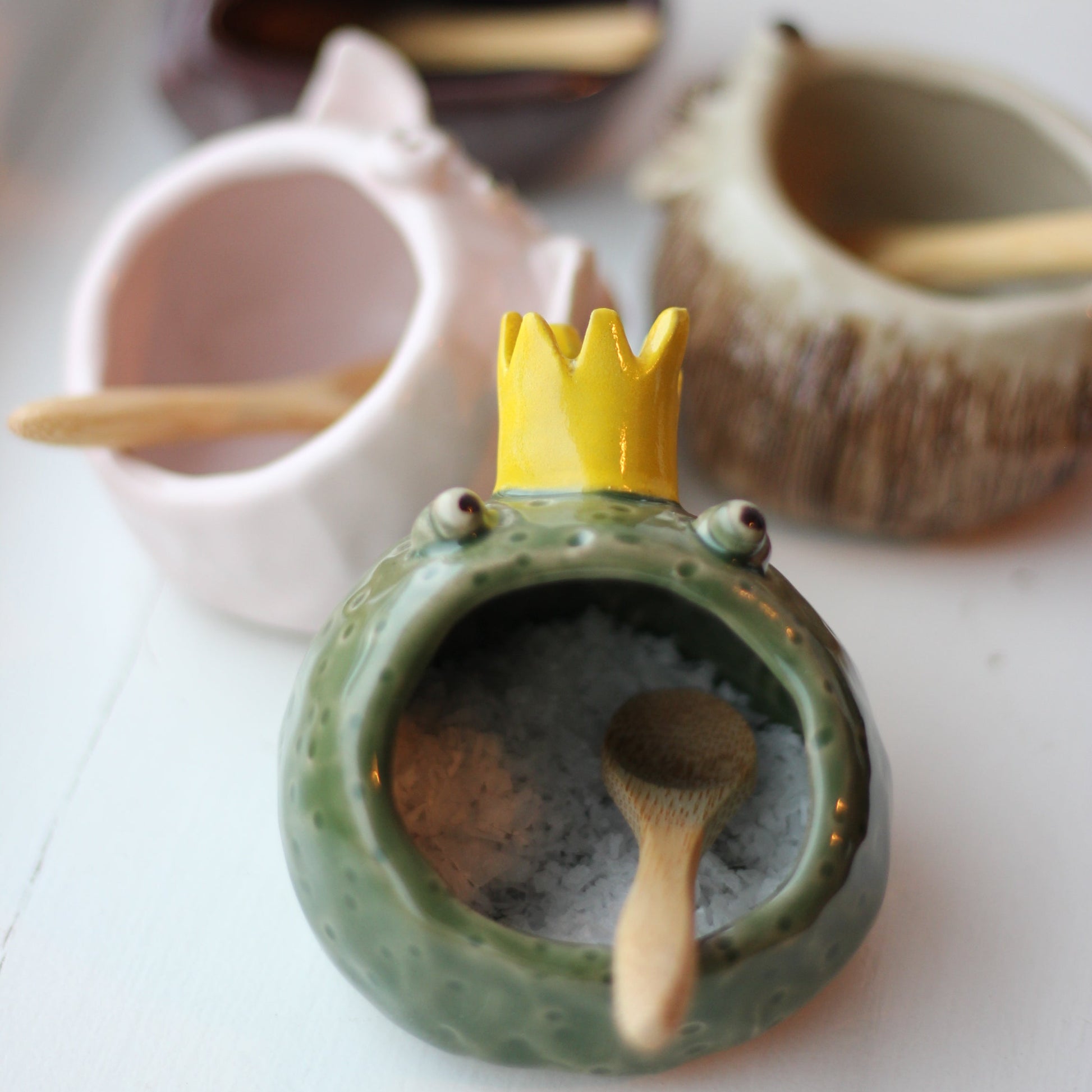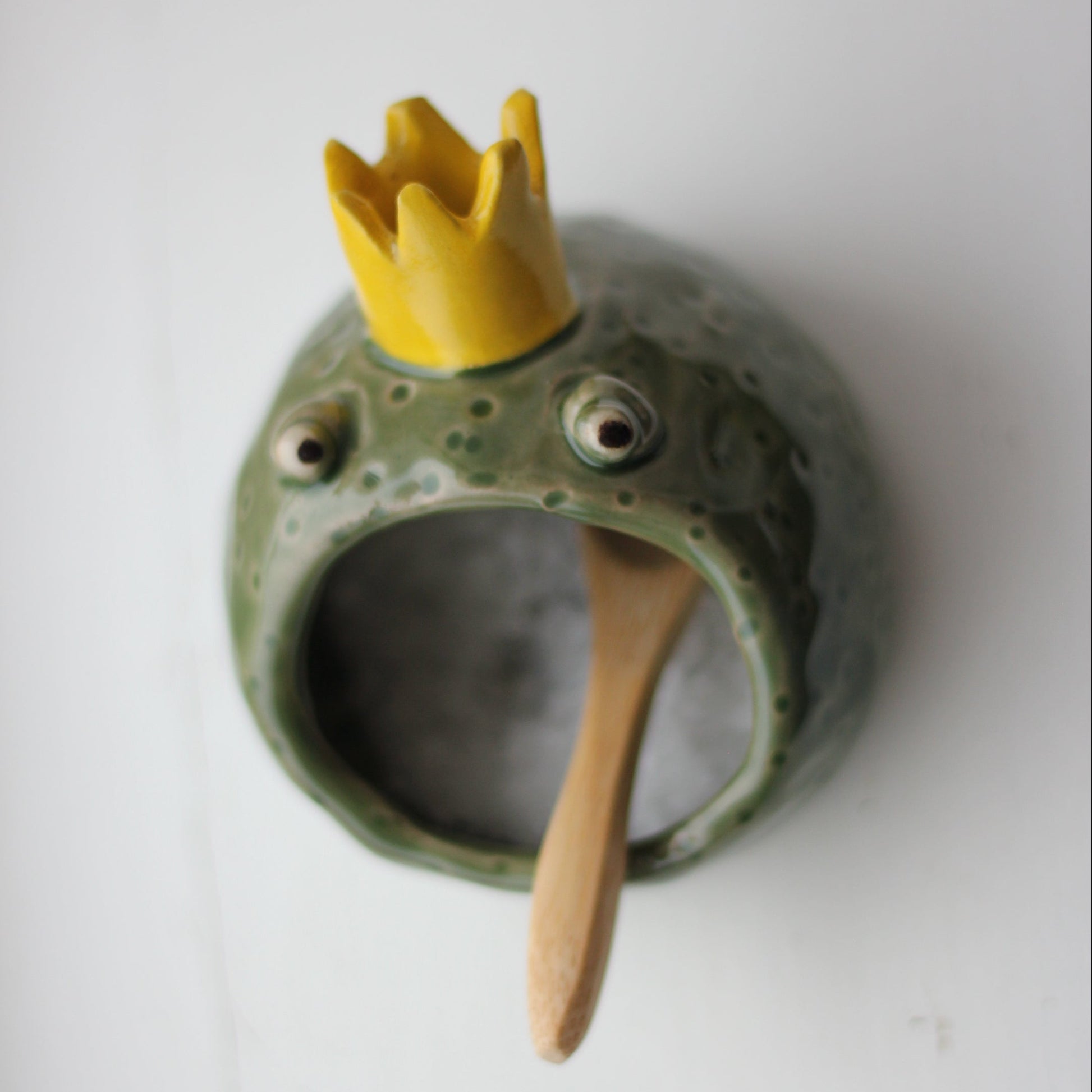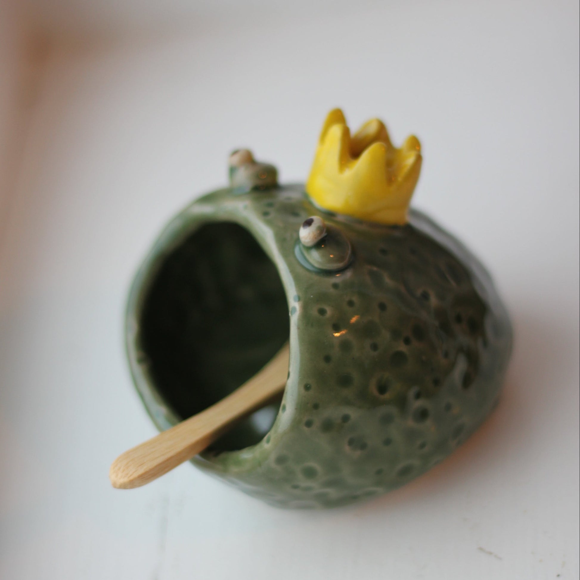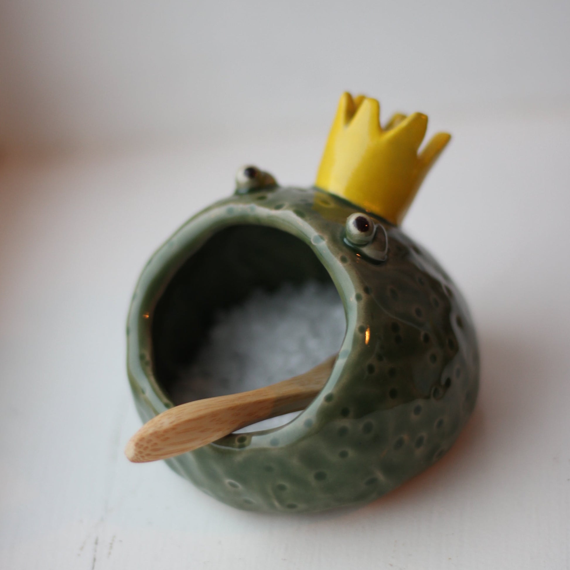 Liten krukke formet som en frosk. Kan brukes til bordsalt, smykker eller andre ting. Grønn glasur med gul krone . Liten skje i bambus følger med.