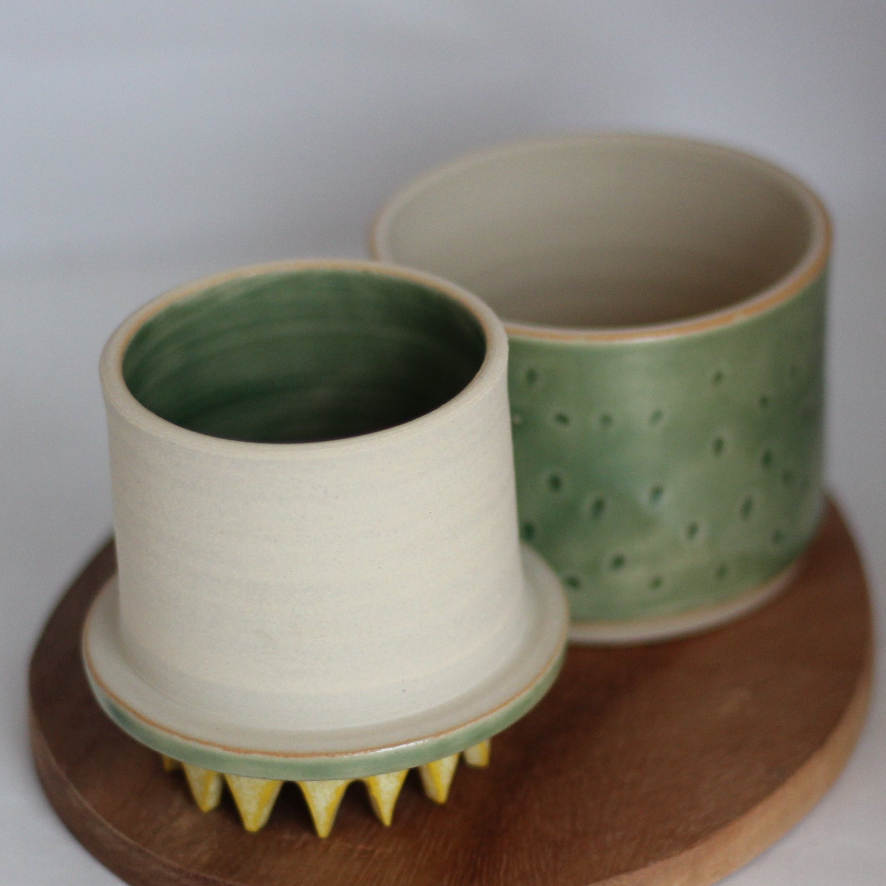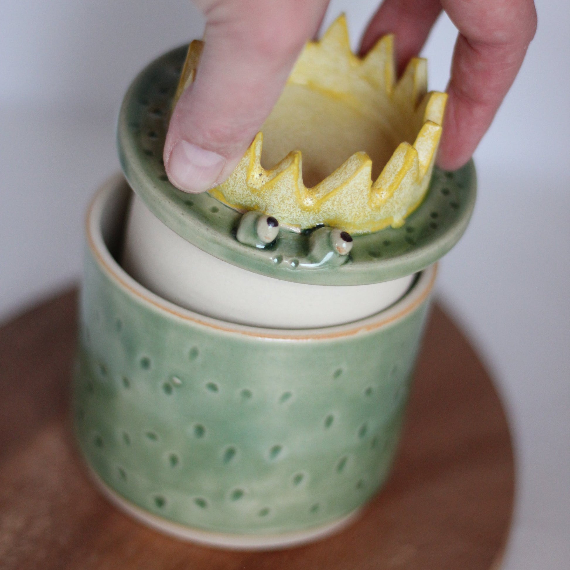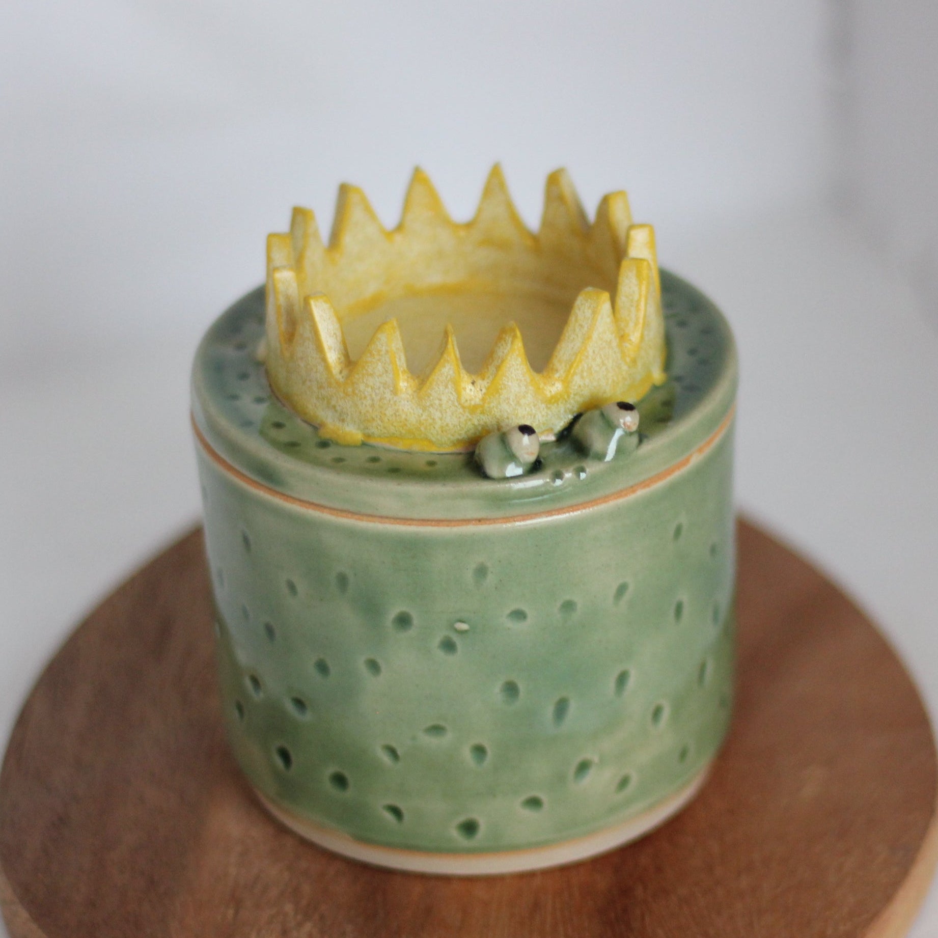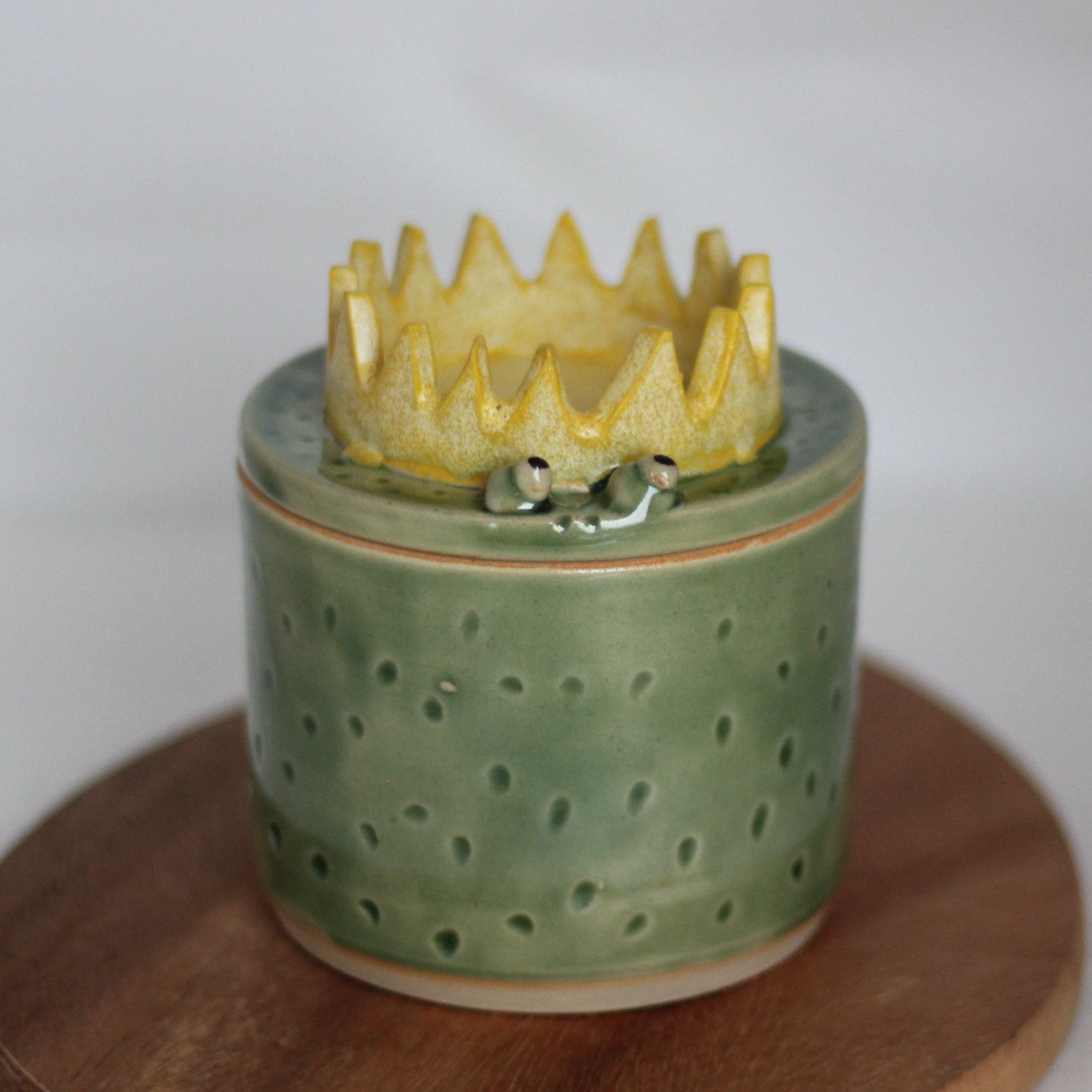 Denne unike utgaven av smørklokken finnes i få eksemplarer og er dreid og dekorert for hånd. Froskeklokken er laget i en lys beige leire og glasert i en lys grønn farge med litt røffere gul krone. Kammeret der smøret oppbevares er glasert, men ellers er den uglasert innvendig.