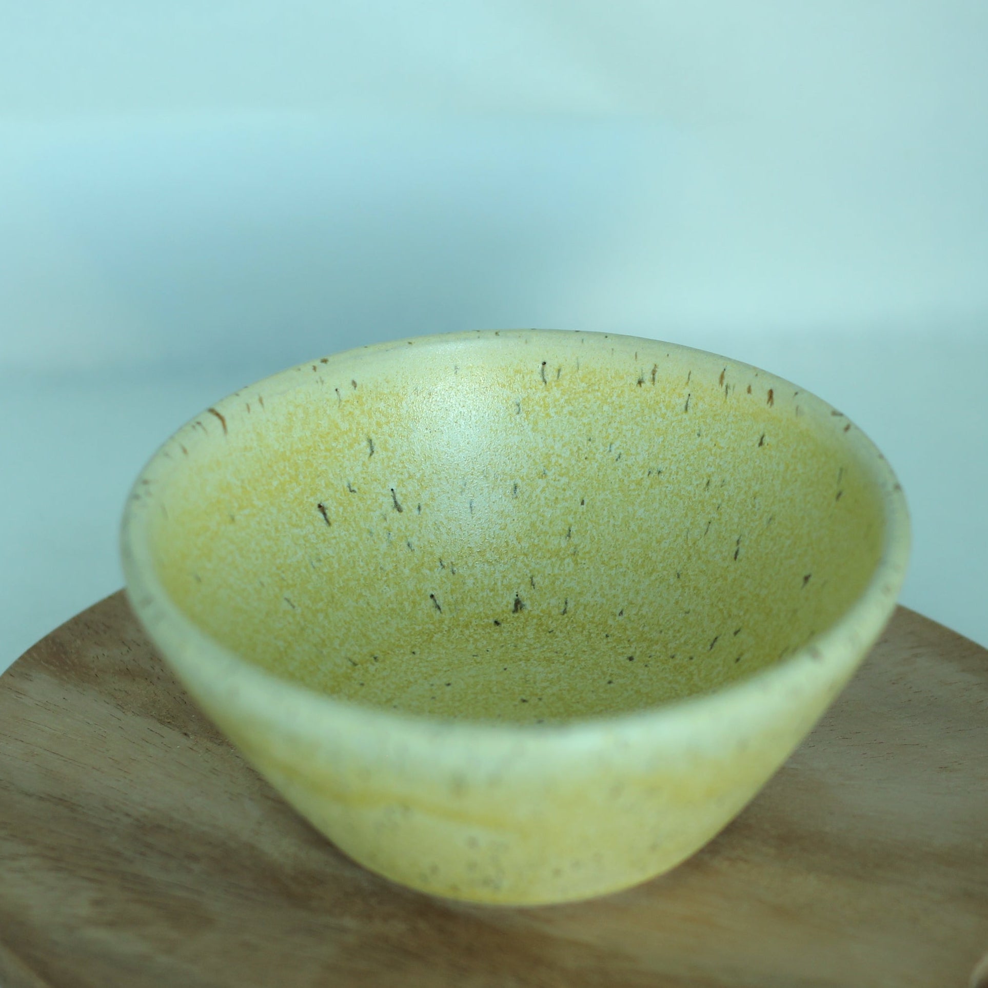 Liten skål i spettet leire med gul glasur