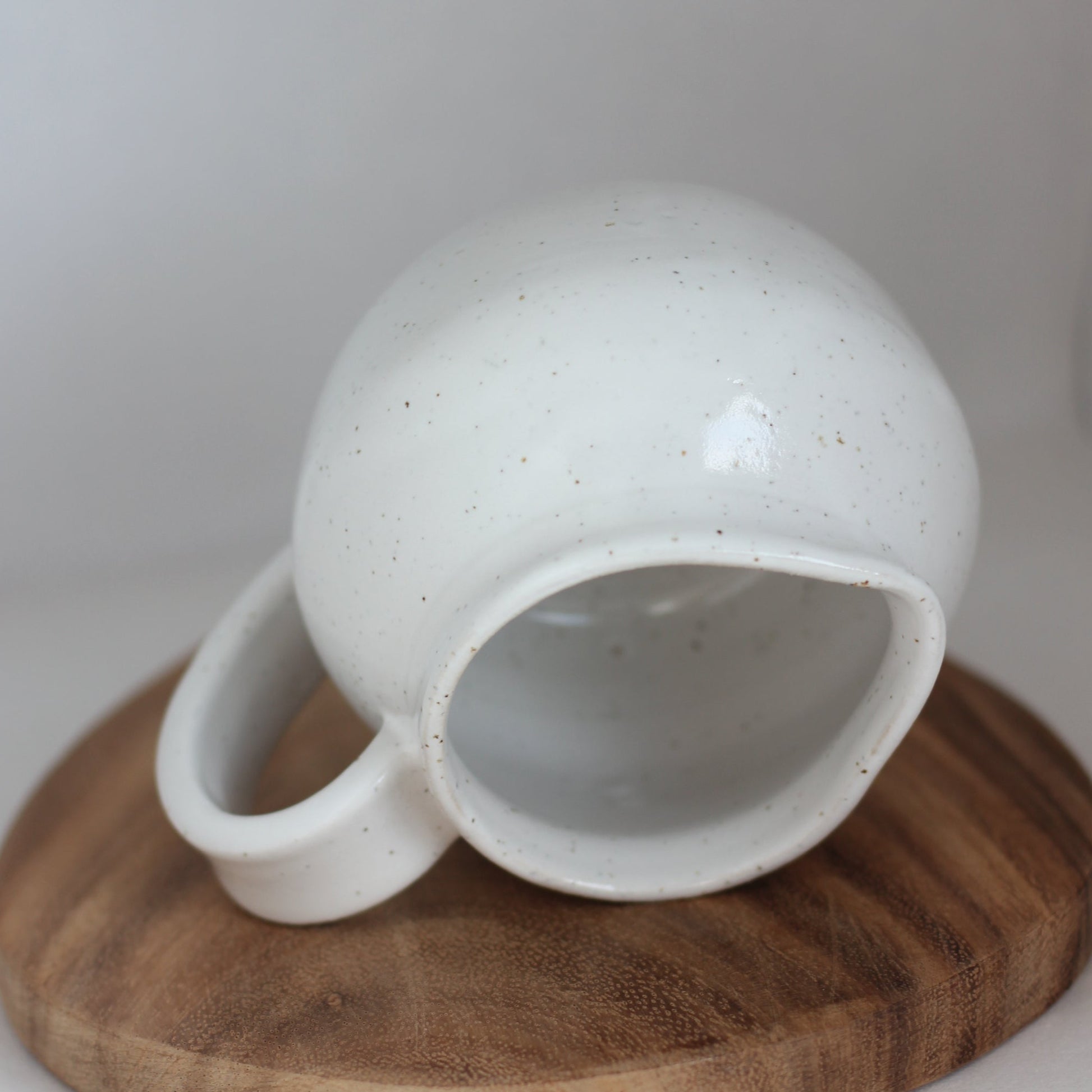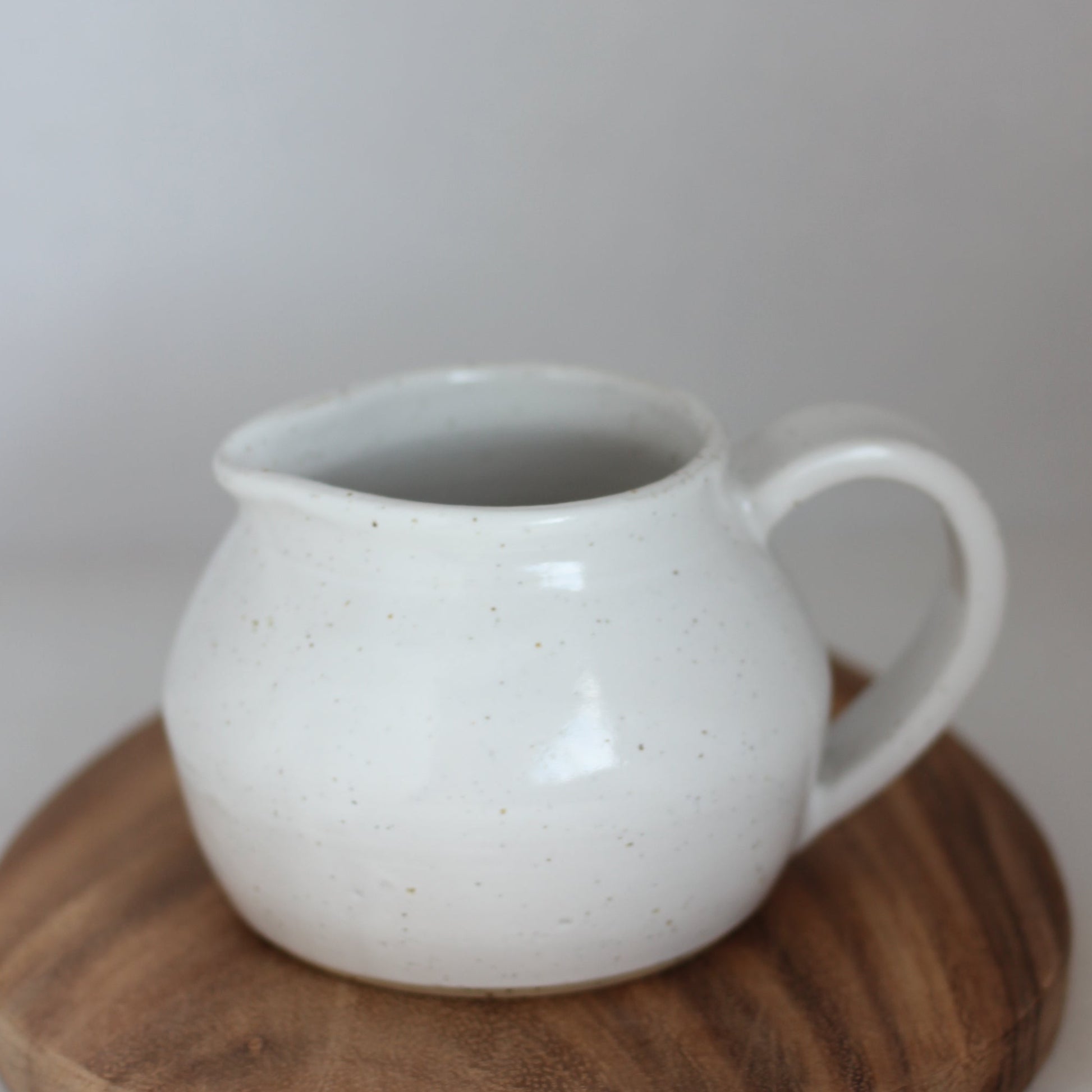 Liten mugge dreid i spettet steongodsleire. Fin til melk, fløte eller saus, til og med små blomster :). Matcher hvit smørklokke i samme farge.