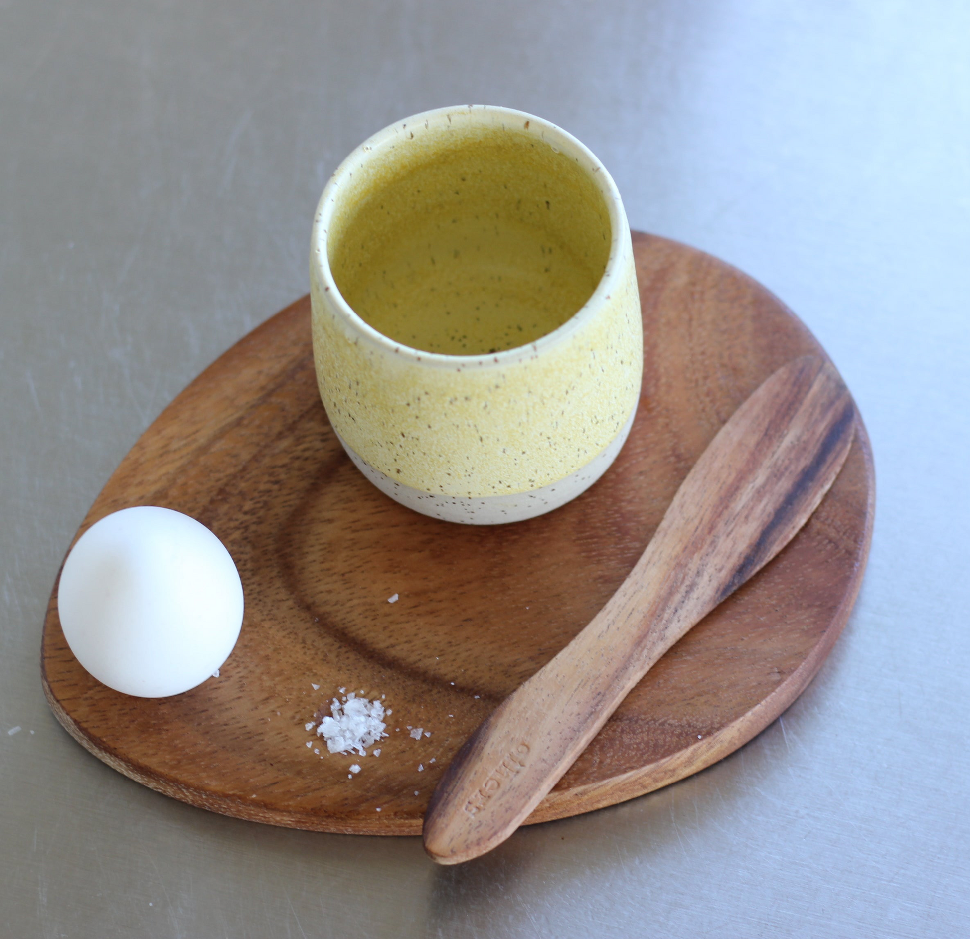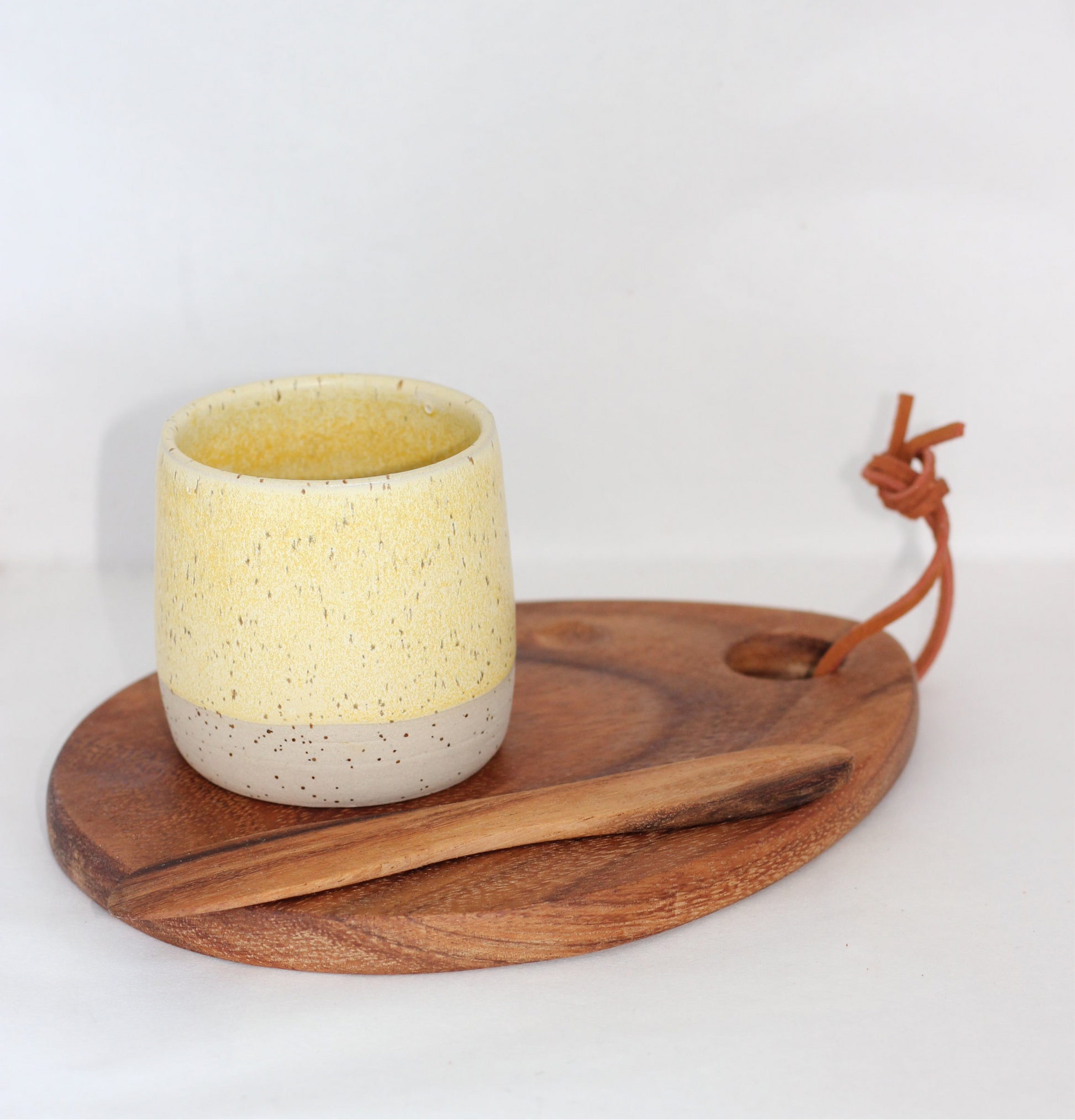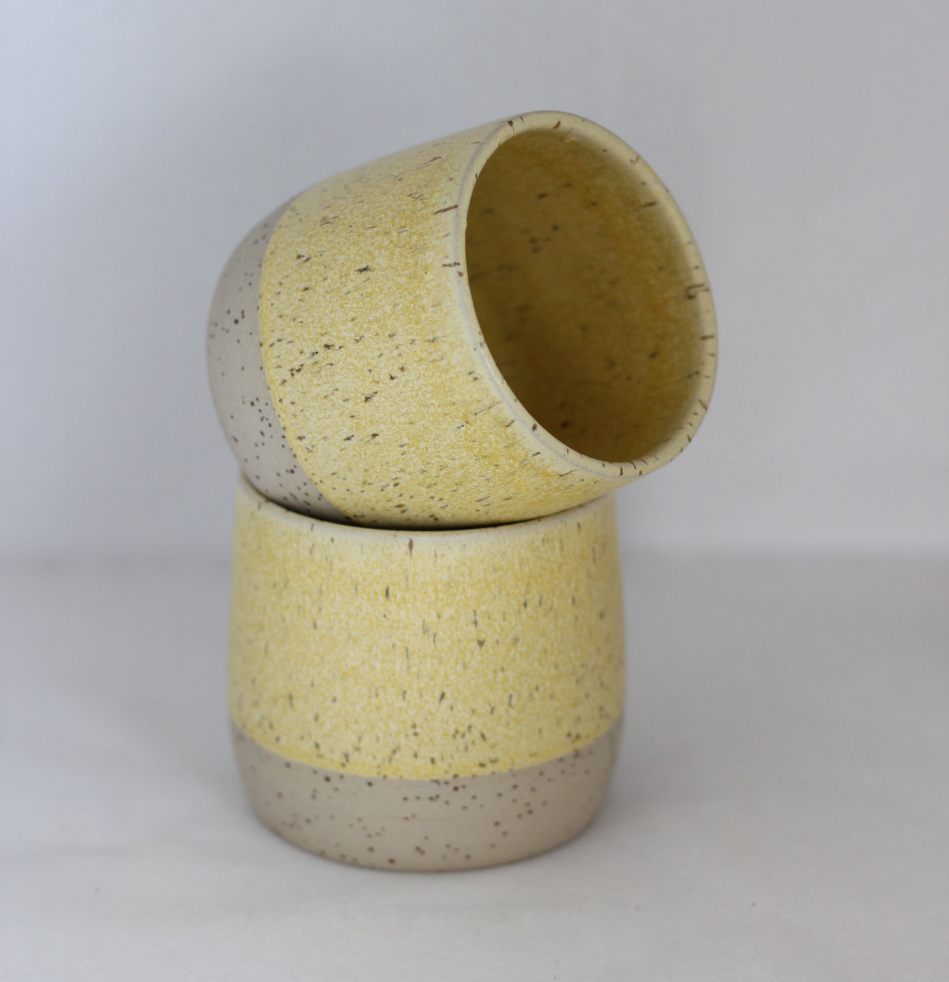 Gul kopp/ tumbler i spettet leire med gul silkematt glasur.