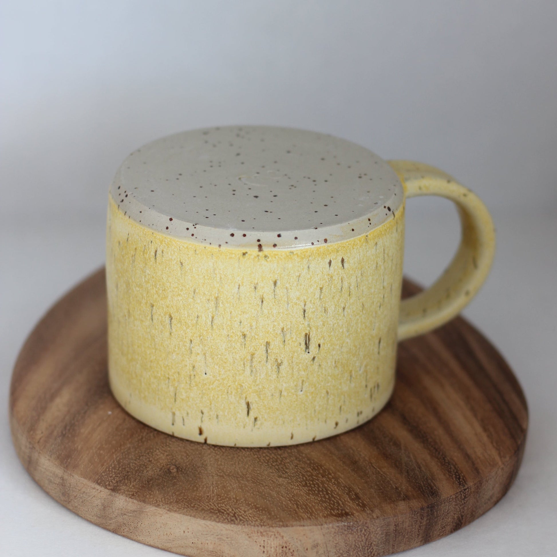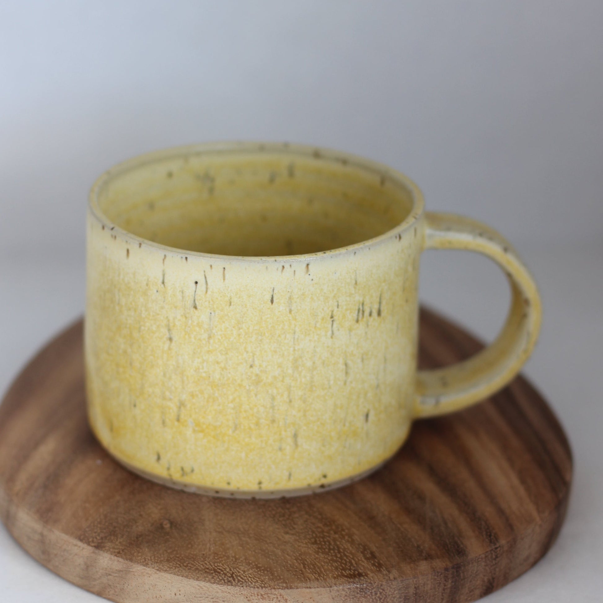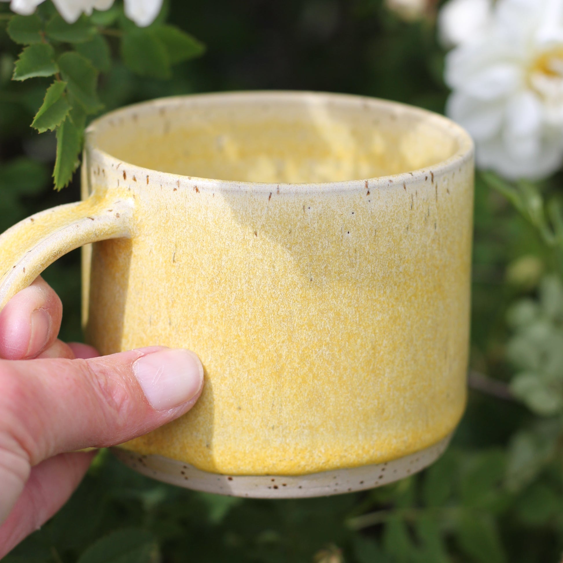 Romslig kopp/ tekopp i gul silkematt glasur på spettet leire, som gjør den prikkete. Lages i flere farger.