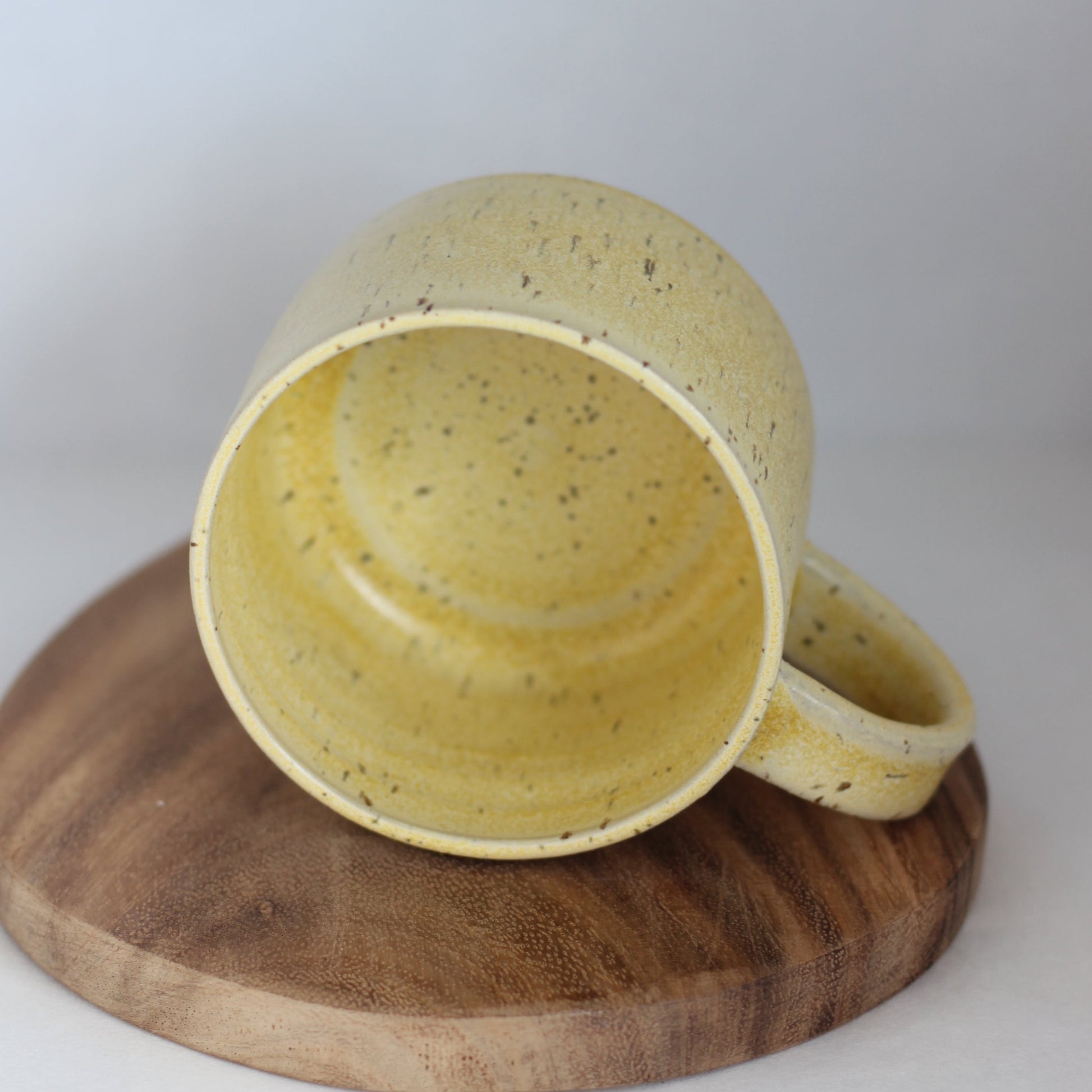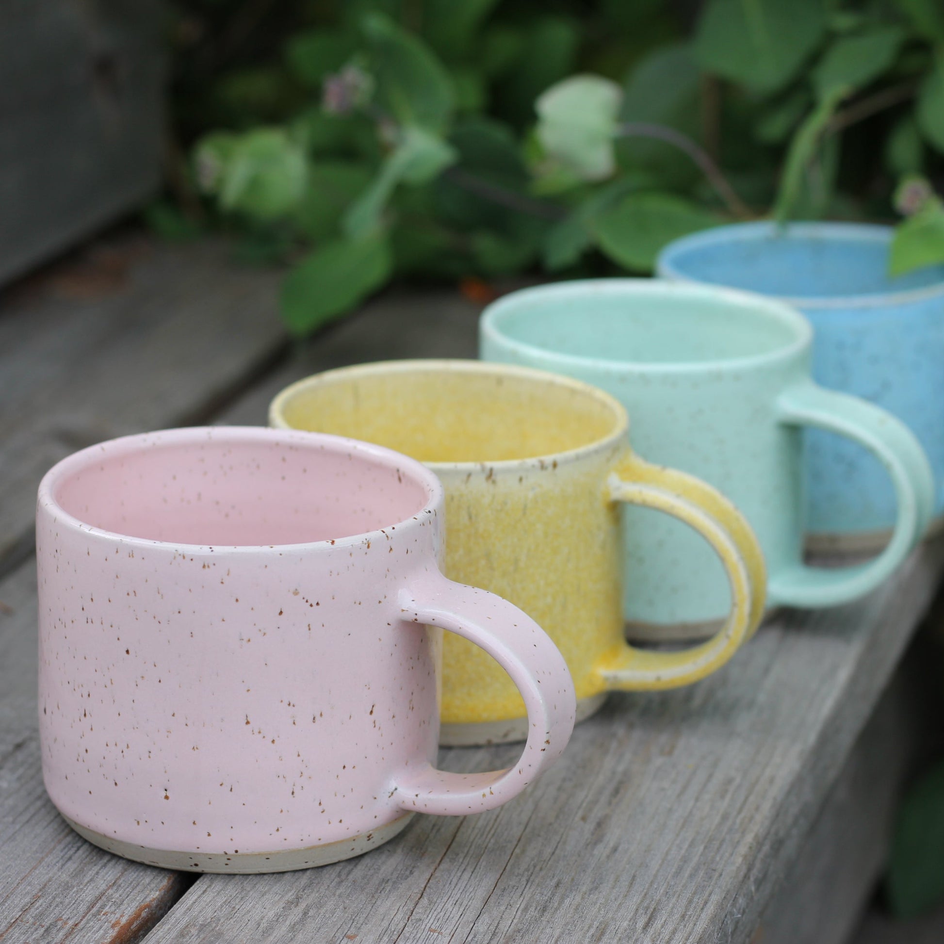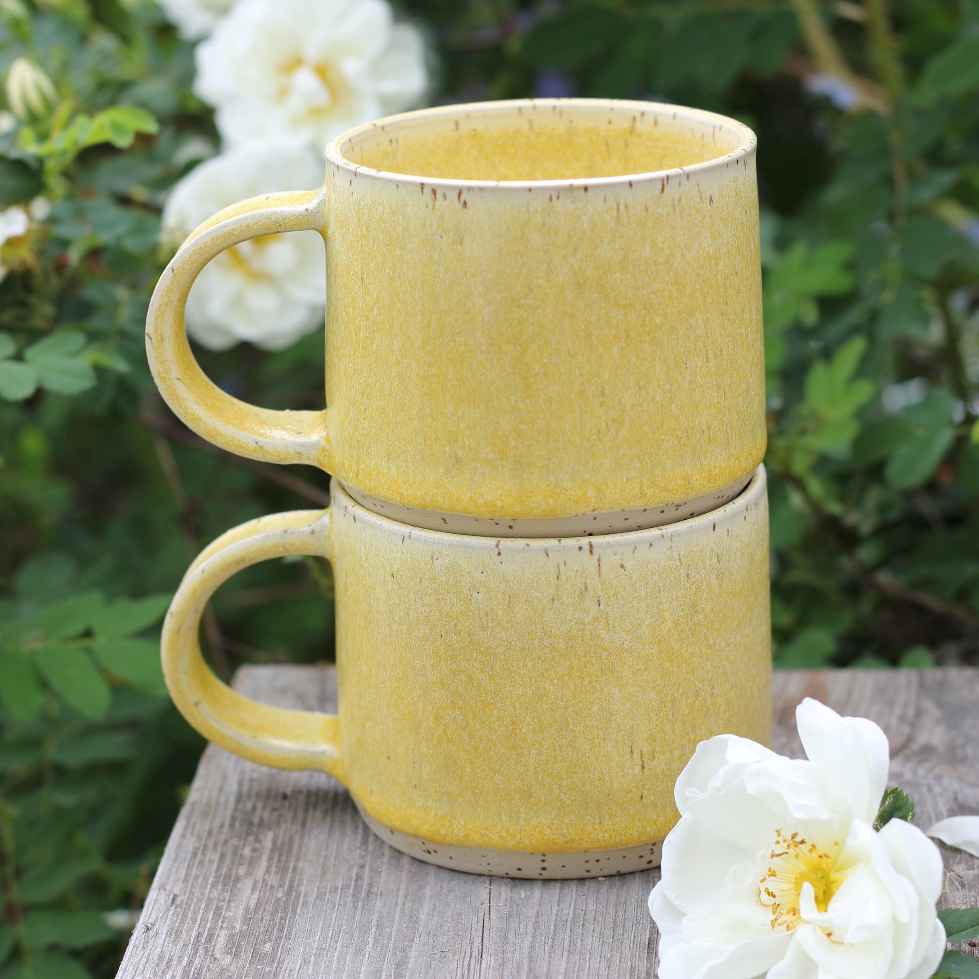 Romslig kopp/ tekopp i gul silkematt glasur på spettet leire, som gjør den prikkete. Lages i flere farger.