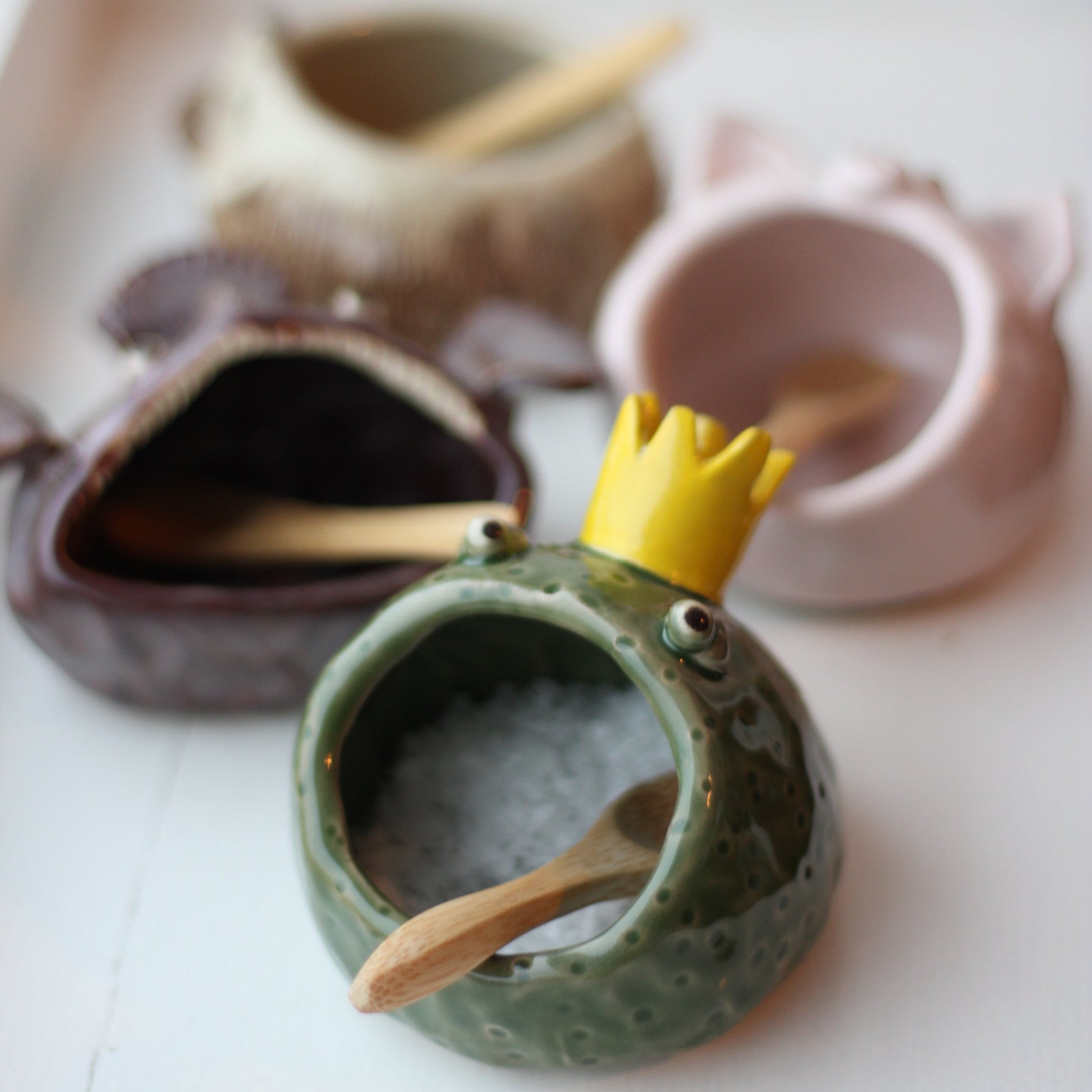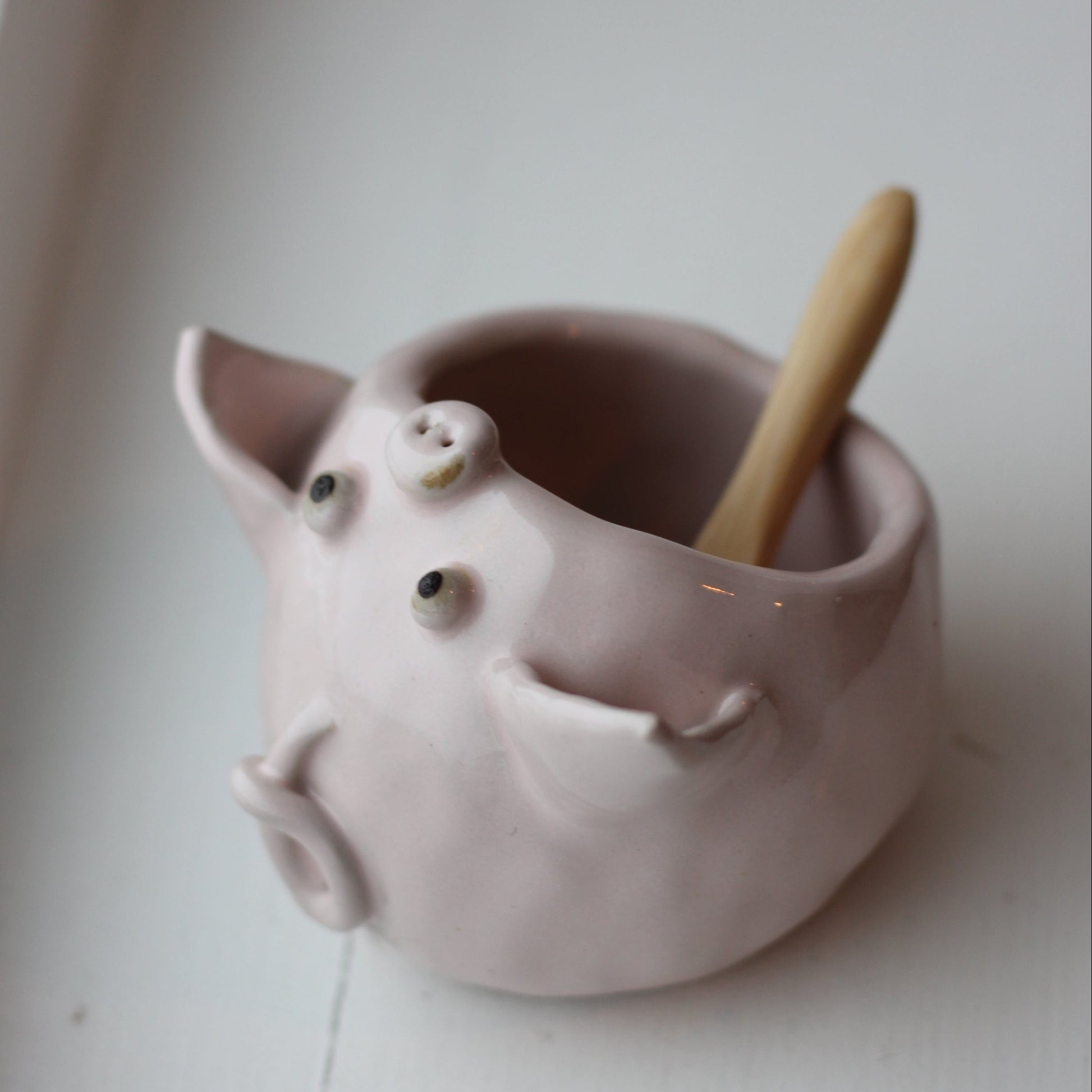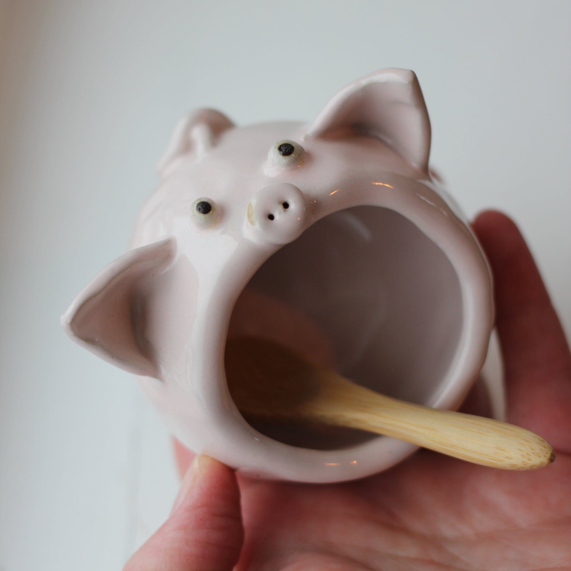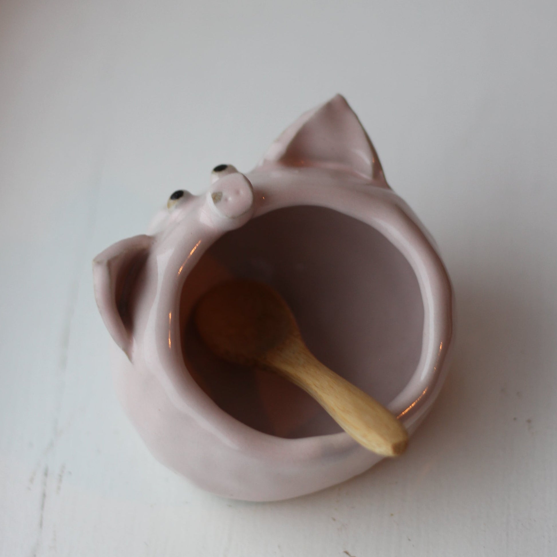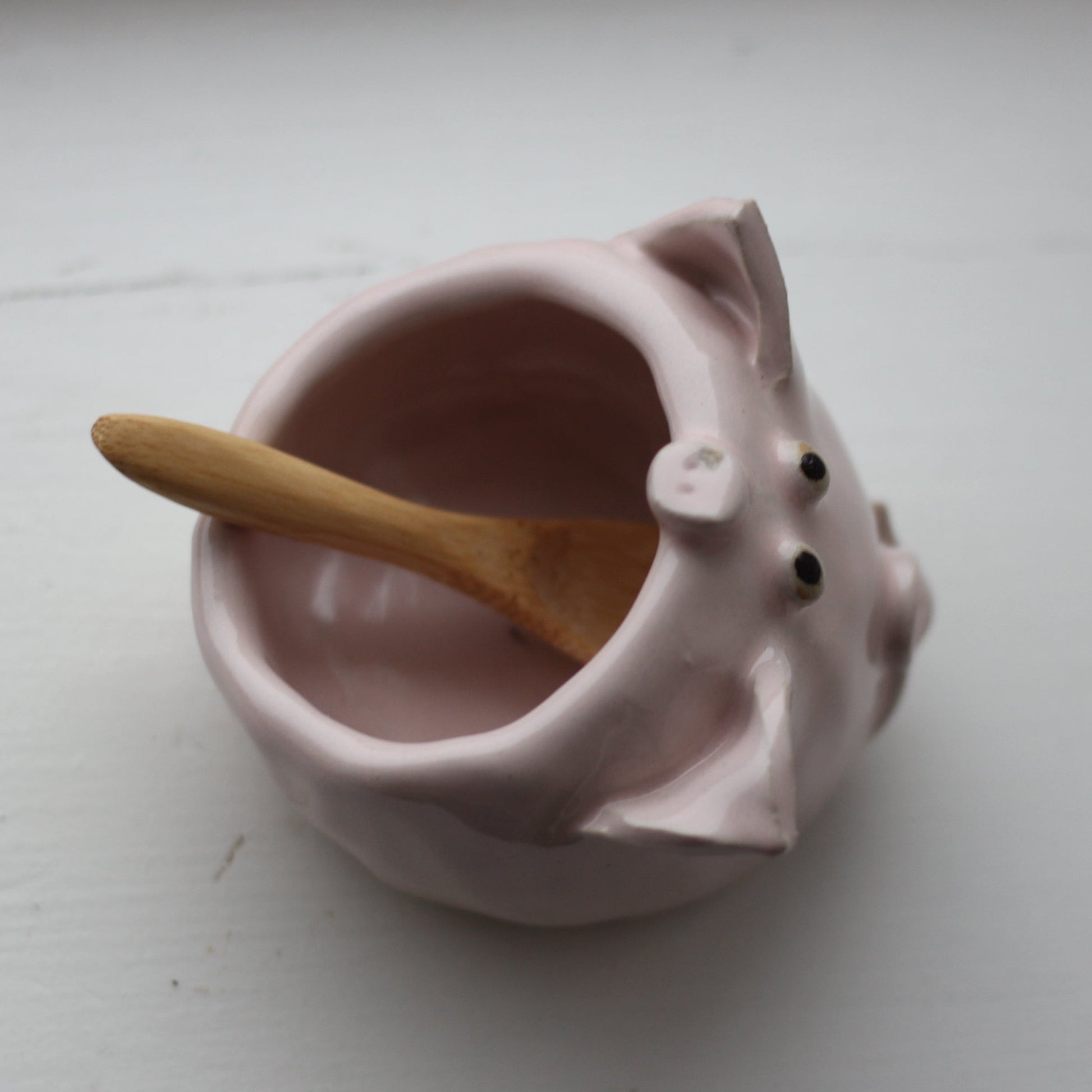 Liten krukke formet som en gris. Kan brukes til bordsalt, smykker eller andre ting. Lys rosa glasur. Liten skje i bambus følger med.