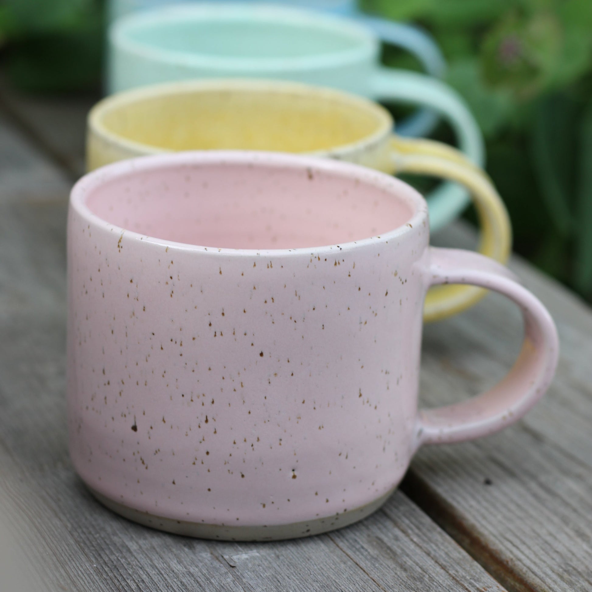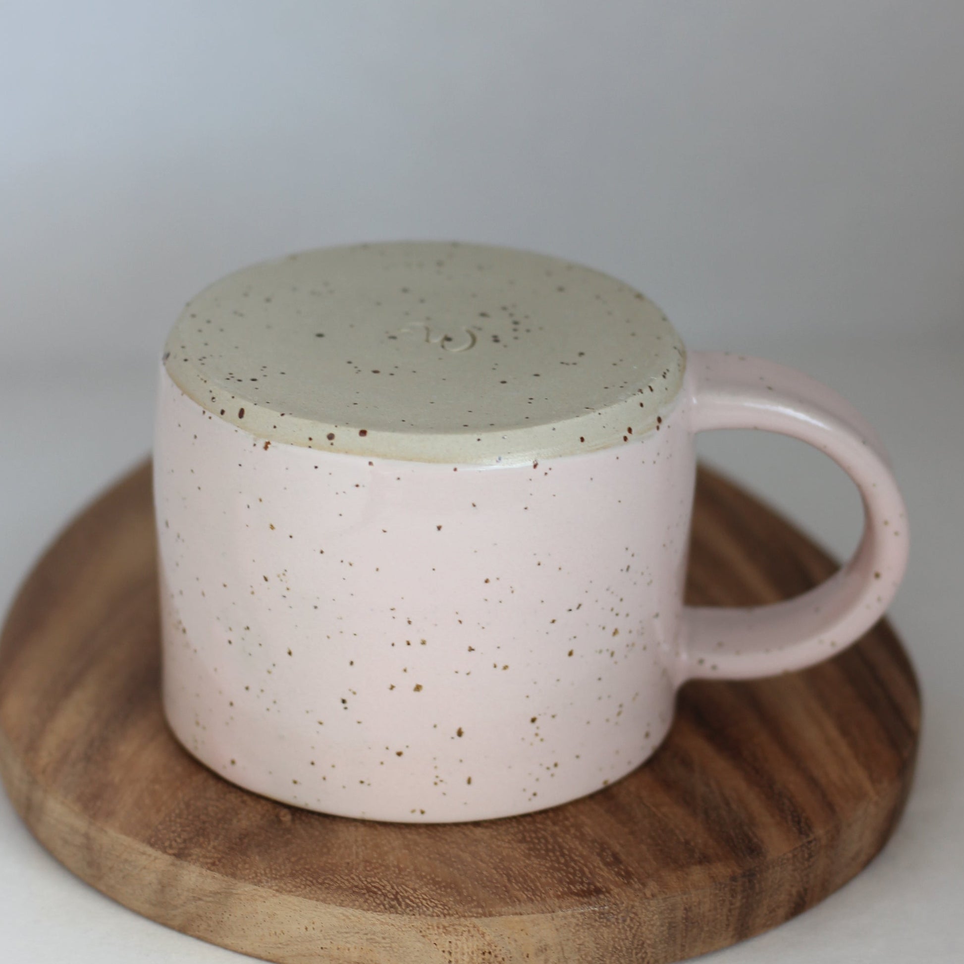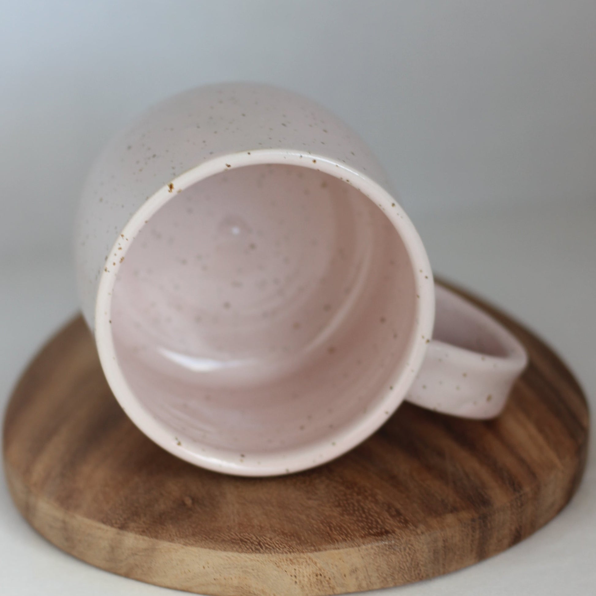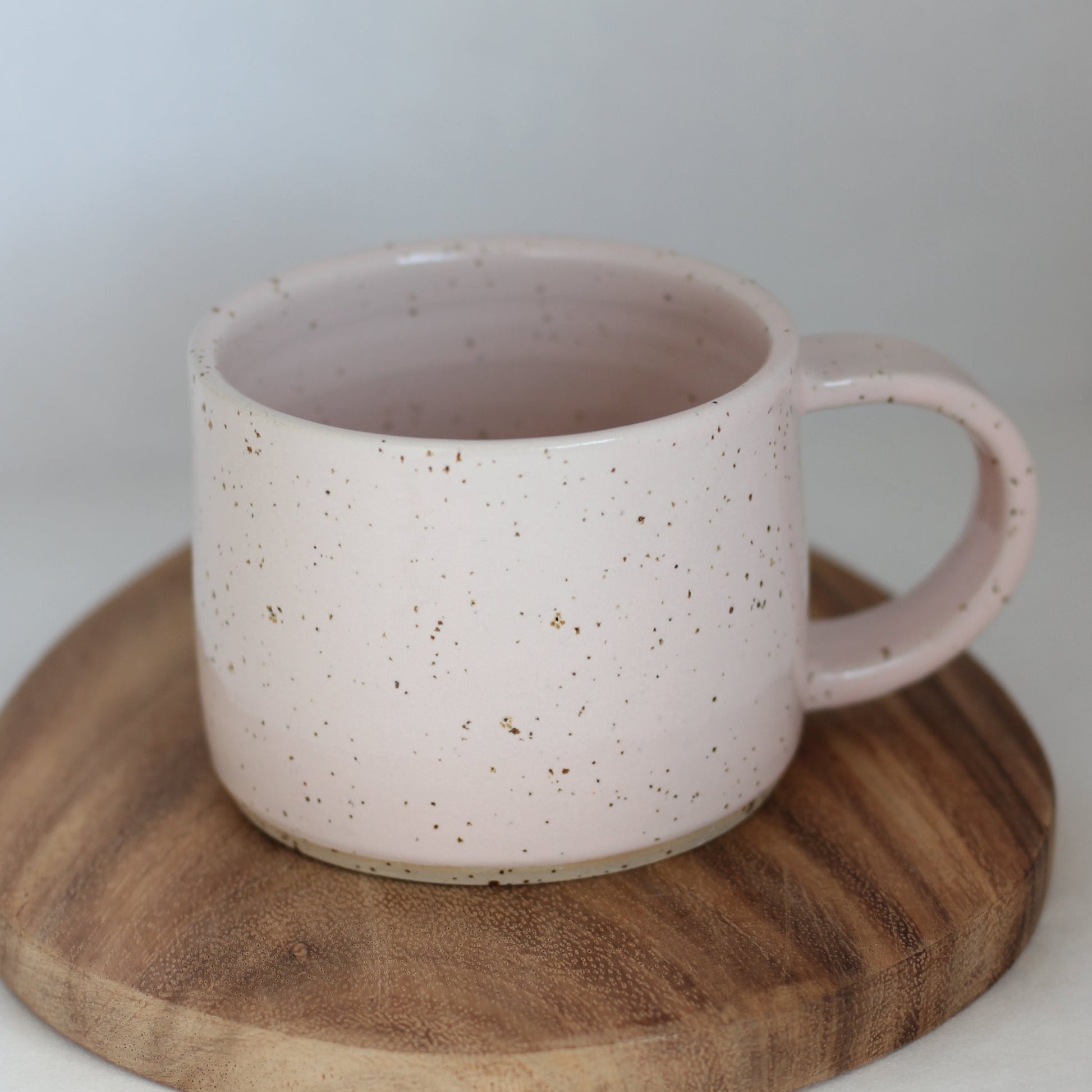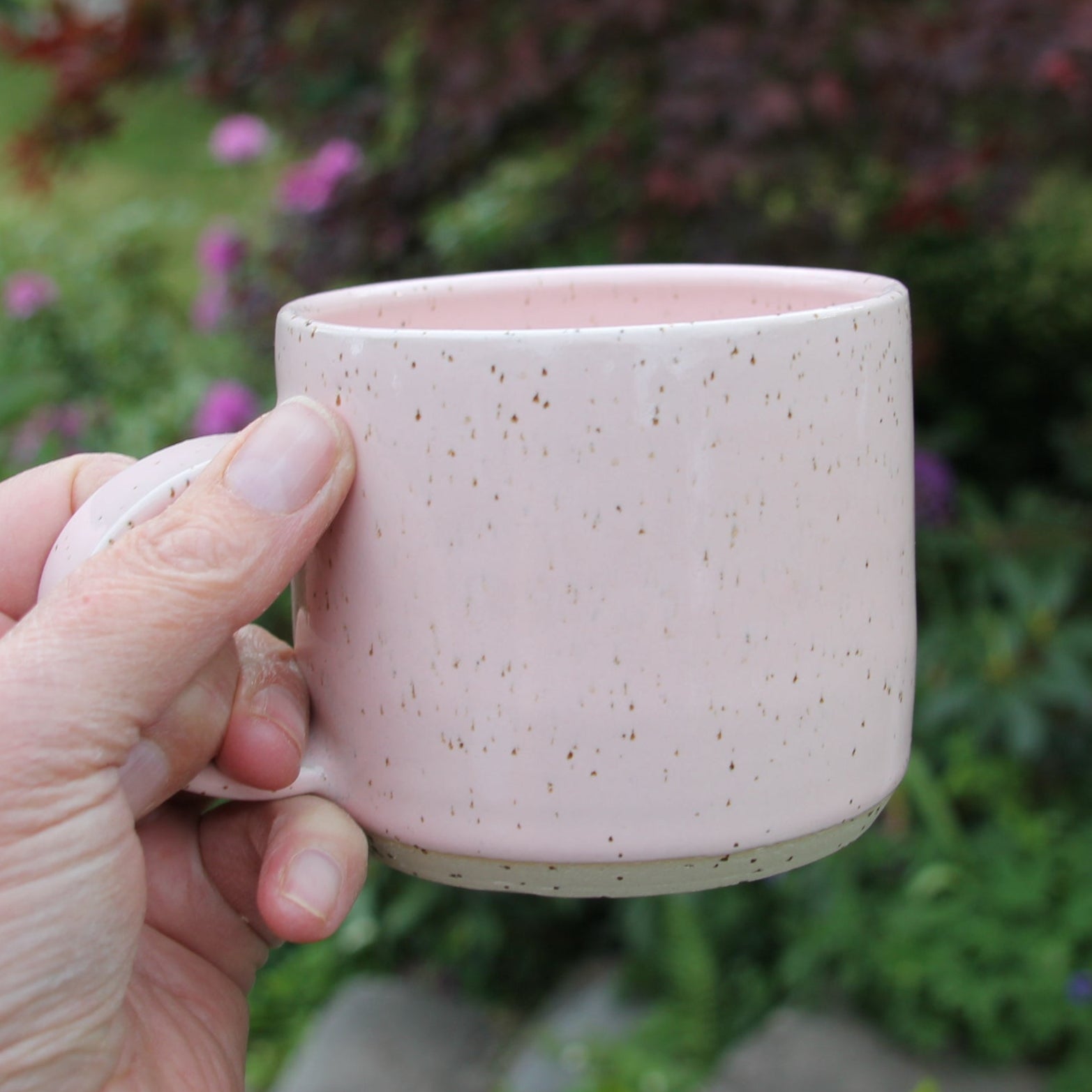 Romslig kopp/tekopp i lys rosa glasur på spettet leire, som gjør den prikkete. Lages i flere farger.