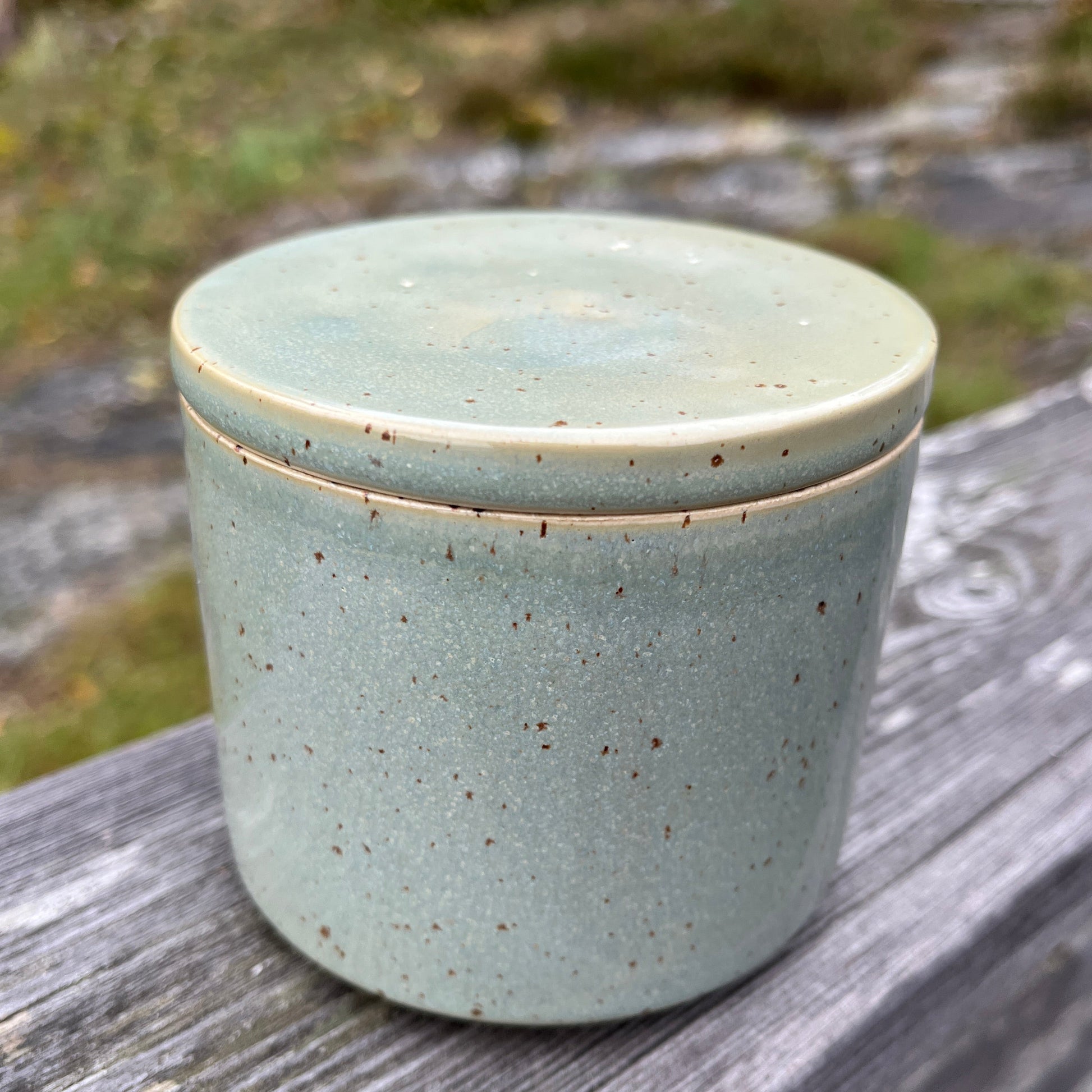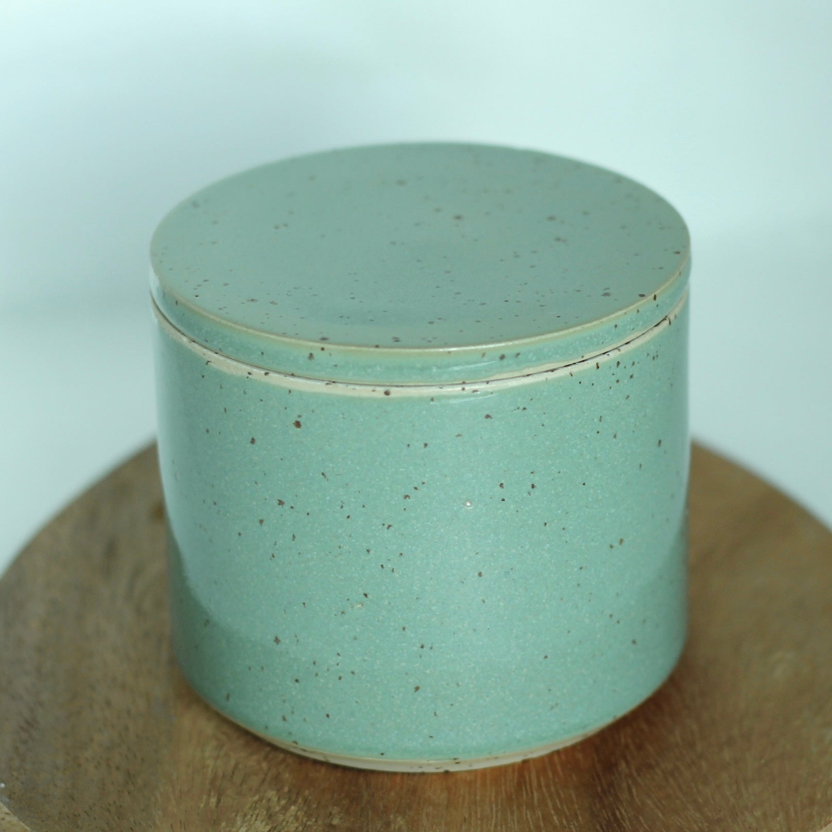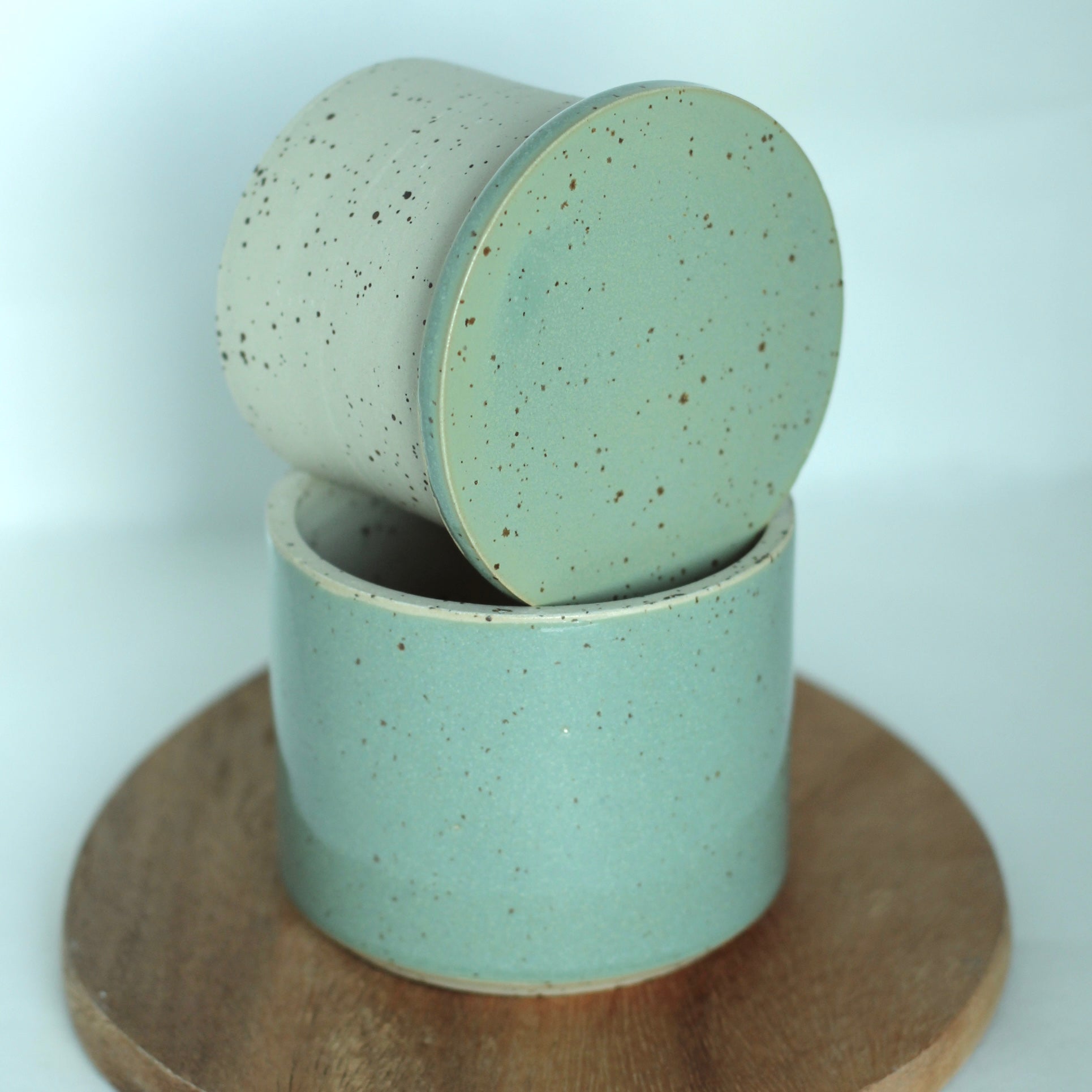 Den spettete leiren og glasuren jeg bruker gjør at hvert produkt kan få litt ulik karakter og litt ulike fargesjatteringer. Spettene i leiren kan av og til gi små fordypninger i glasuren.Str. ca 9 cm høy og 9,5 cm i diameter, men små variasjoner i størrelser vil forekomme.