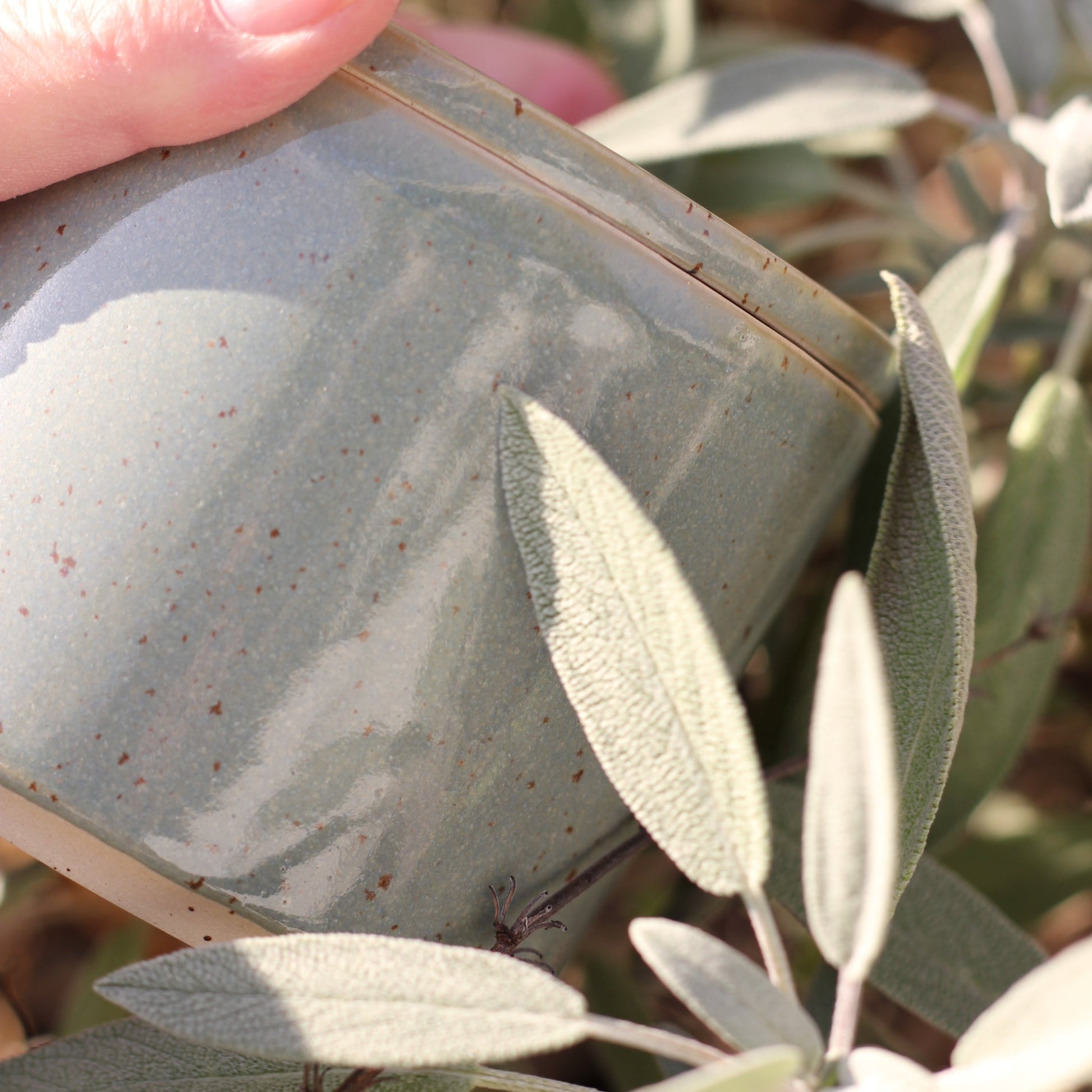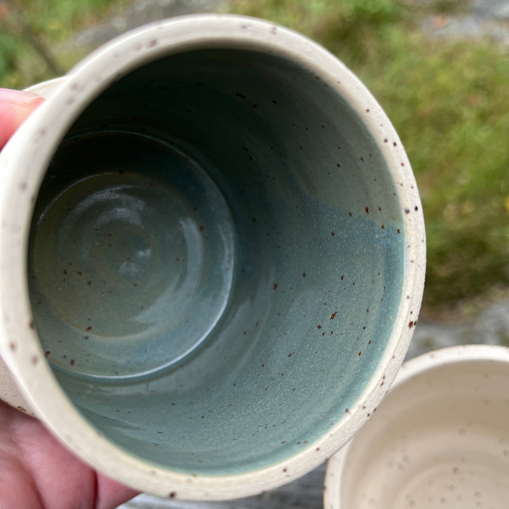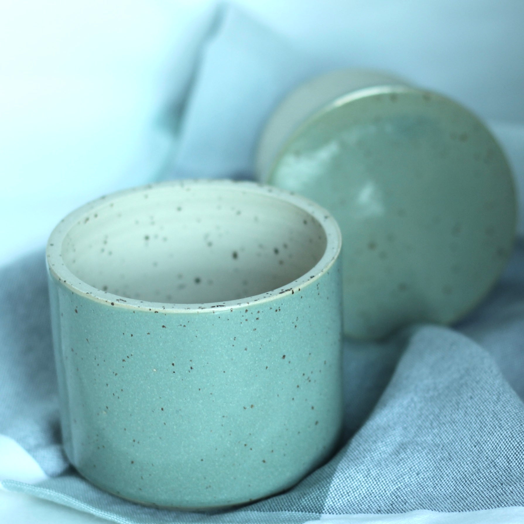 Den spettete leiren og glasuren jeg bruker gjør at hvert produkt kan få litt ulik karakter og litt ulike fargesjatteringer. Spettene i leiren kan av og til gi små fordypninger i glasuren.Str. ca 9 cm høy og 9,5 cm i diameter, men små variasjoner i størrelser vil forekomme.