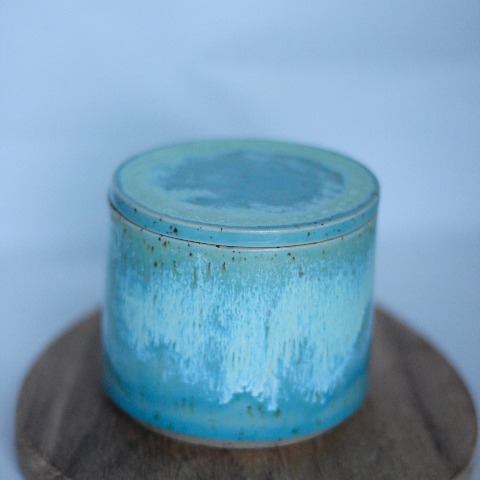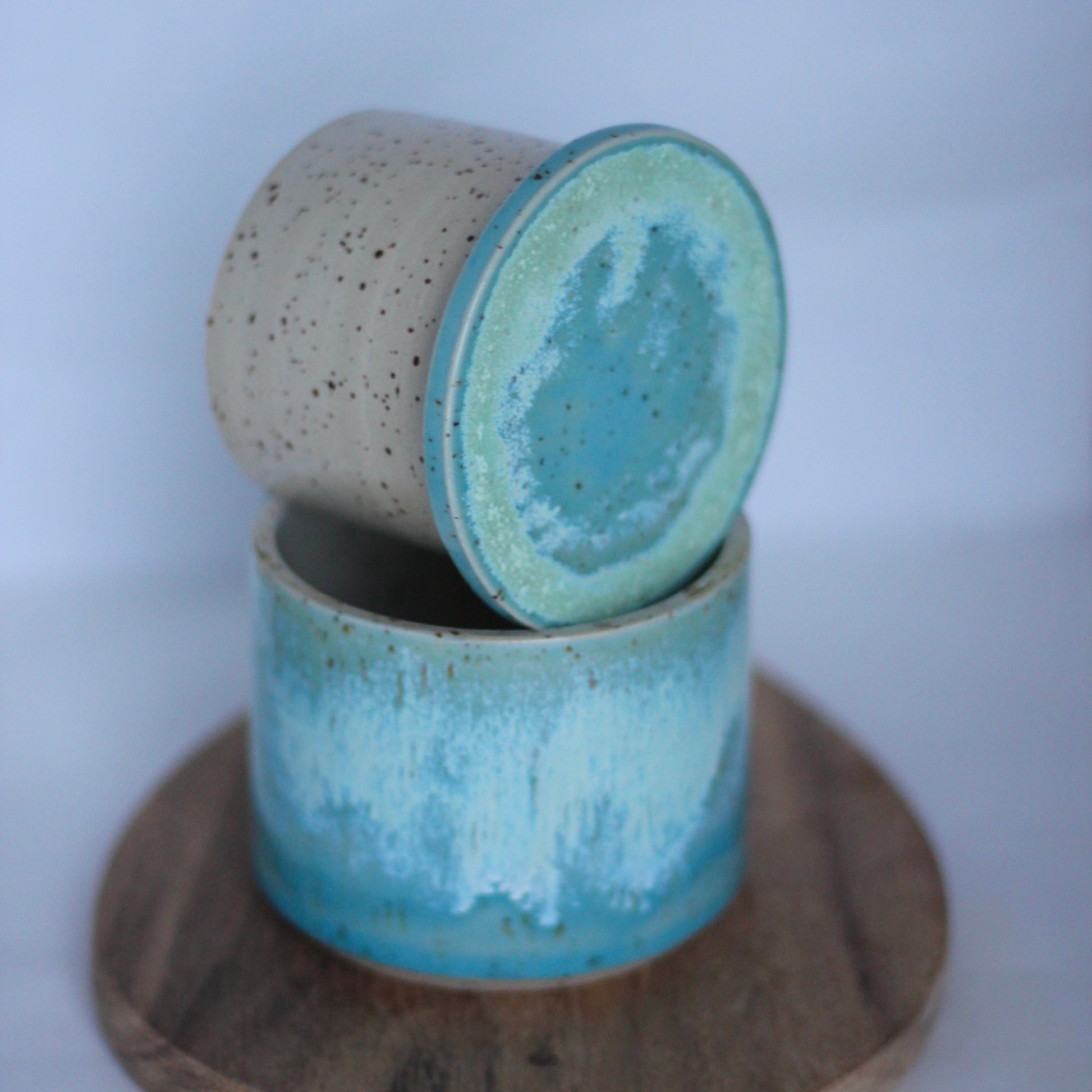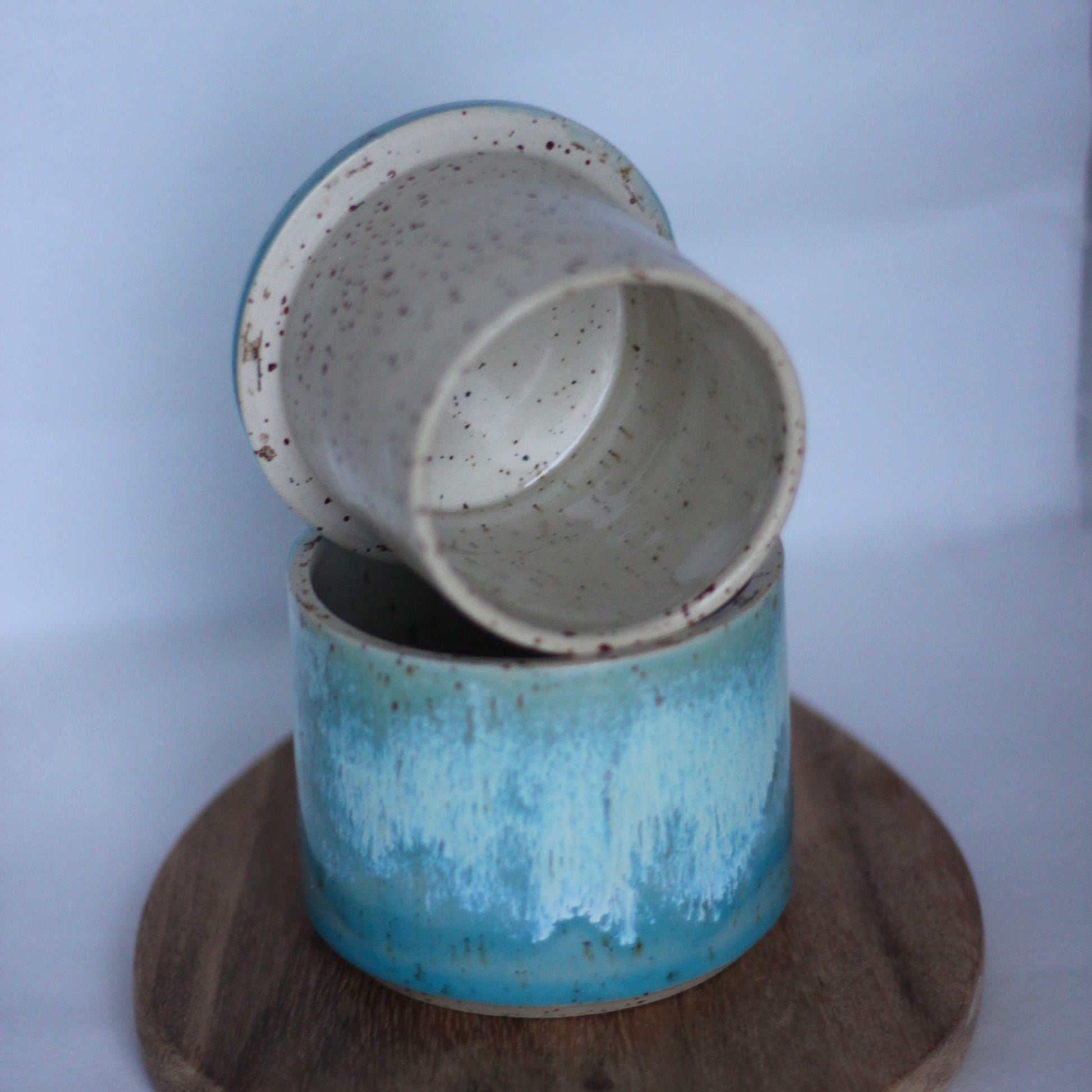 Den spettete leiren og glasuren jeg bruker gjør at hvert produkt kan få litt ulik karakter og litt ulike fargesjatteringer. Spettene i leiren kan av og til gi små fordypninger i glasuren.Str. ca 9 cm høy og 9,5 cm i diameter, men små variasjoner i størrelser vil forekomme.