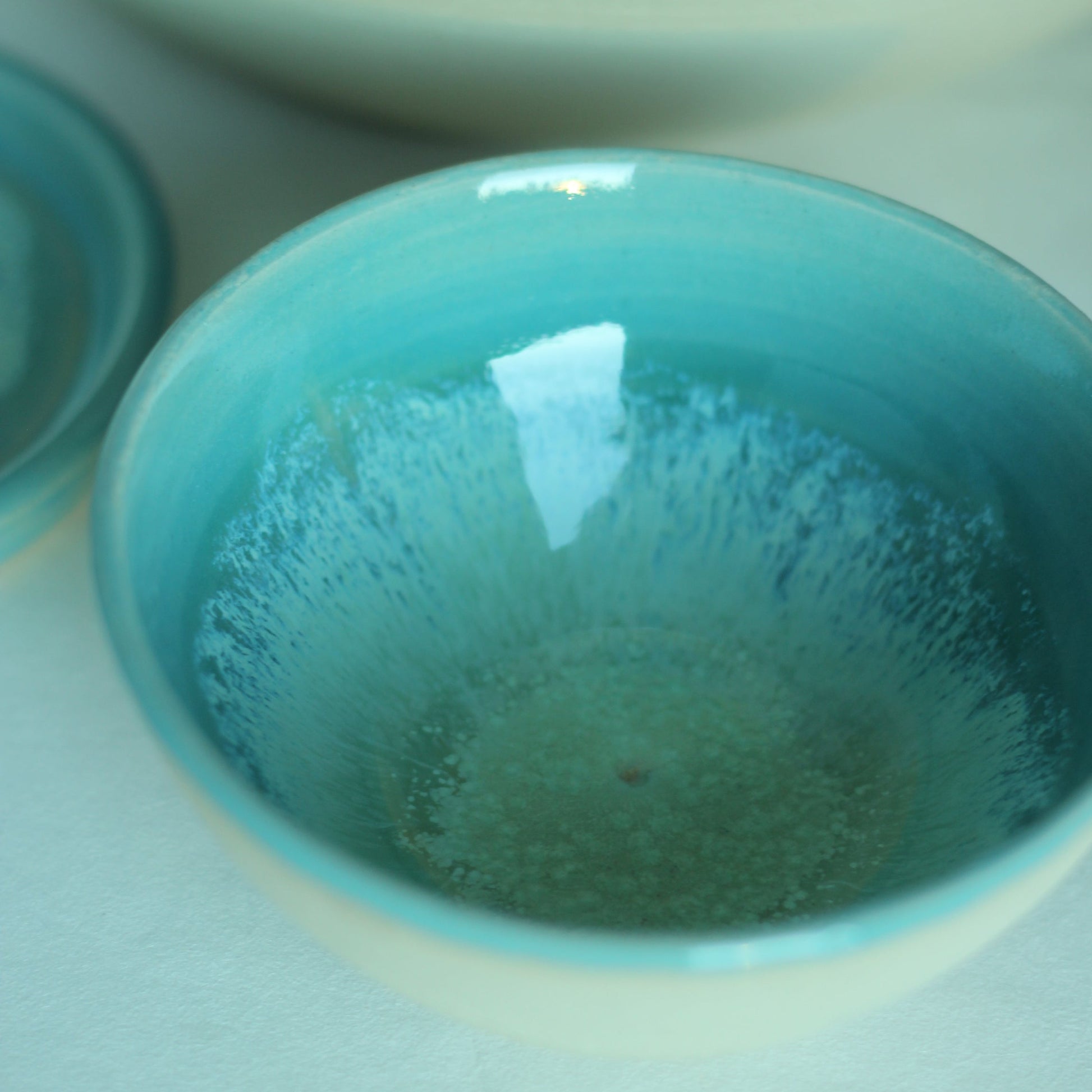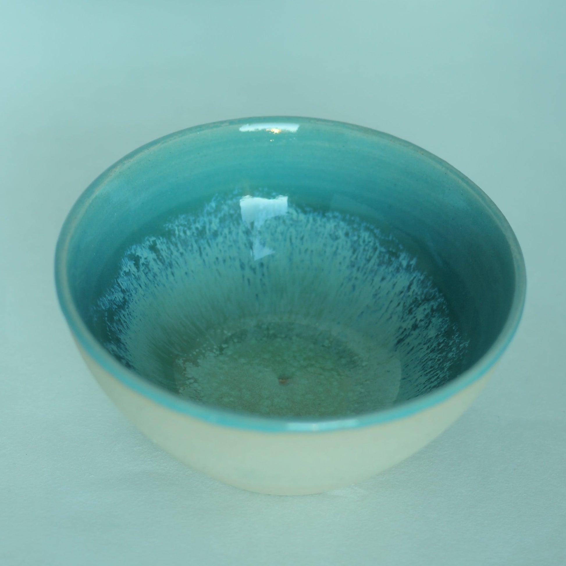 Liten bolle i sandfarget leire glasert i turkis og grønne toner. Bollen er glasert inni og uglasert utevendig. Den måler ca 10 cm i diameter.
