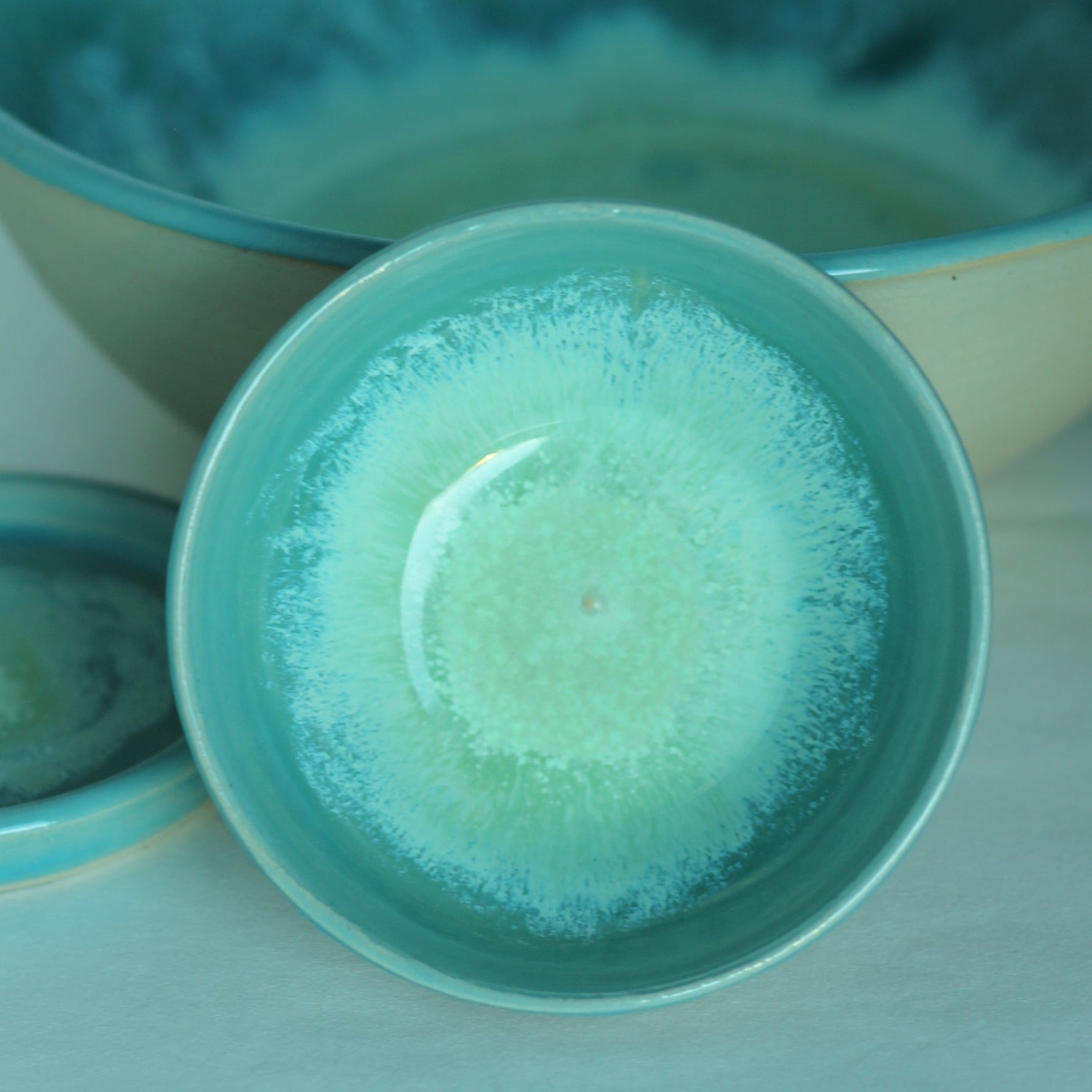 Det finnes en stor skål og små skåler/lysfat i samme farge, samt vase/ krukke.